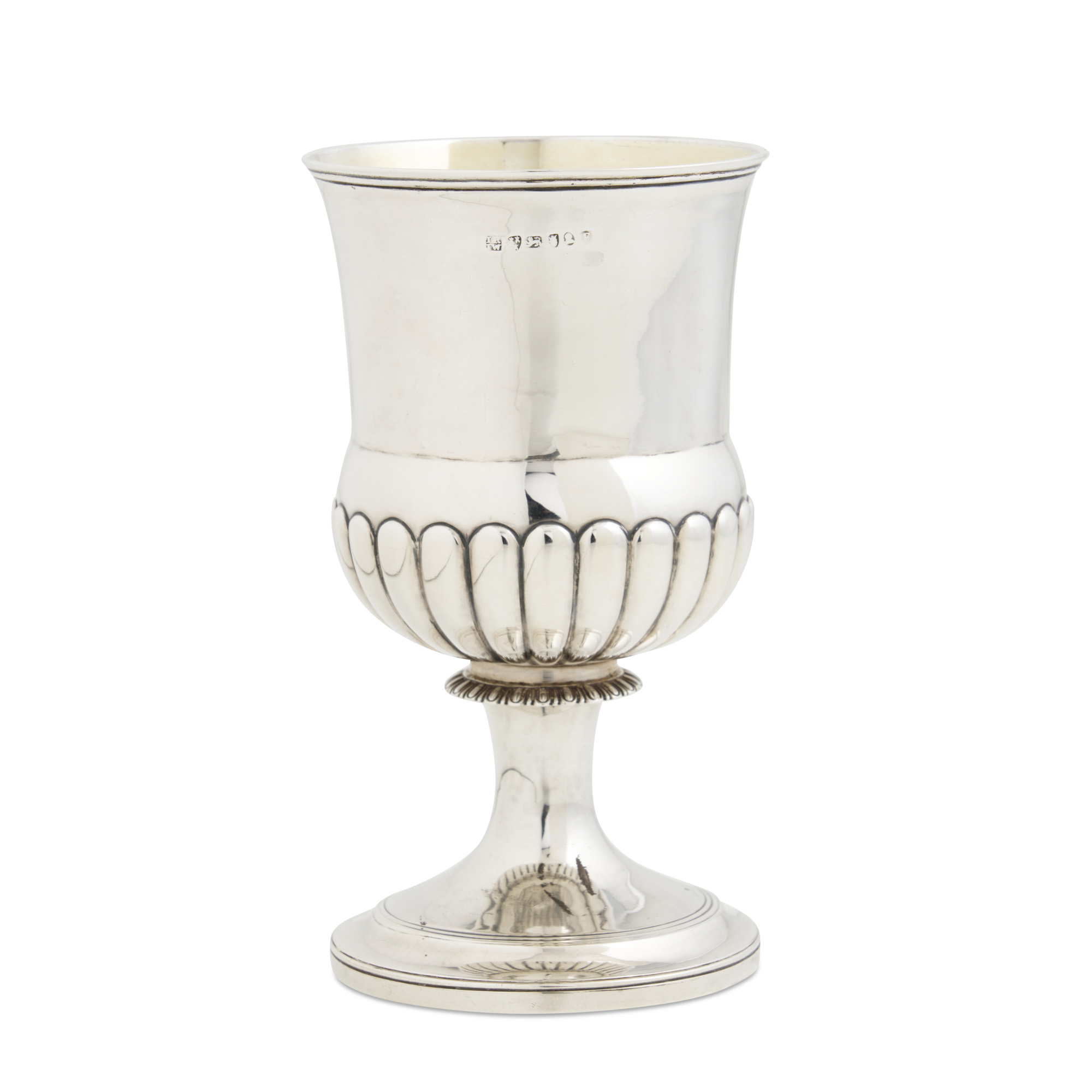The body gadrooned to its swelling lower part on a stem with gadrooned blade knop and moulded circular foot