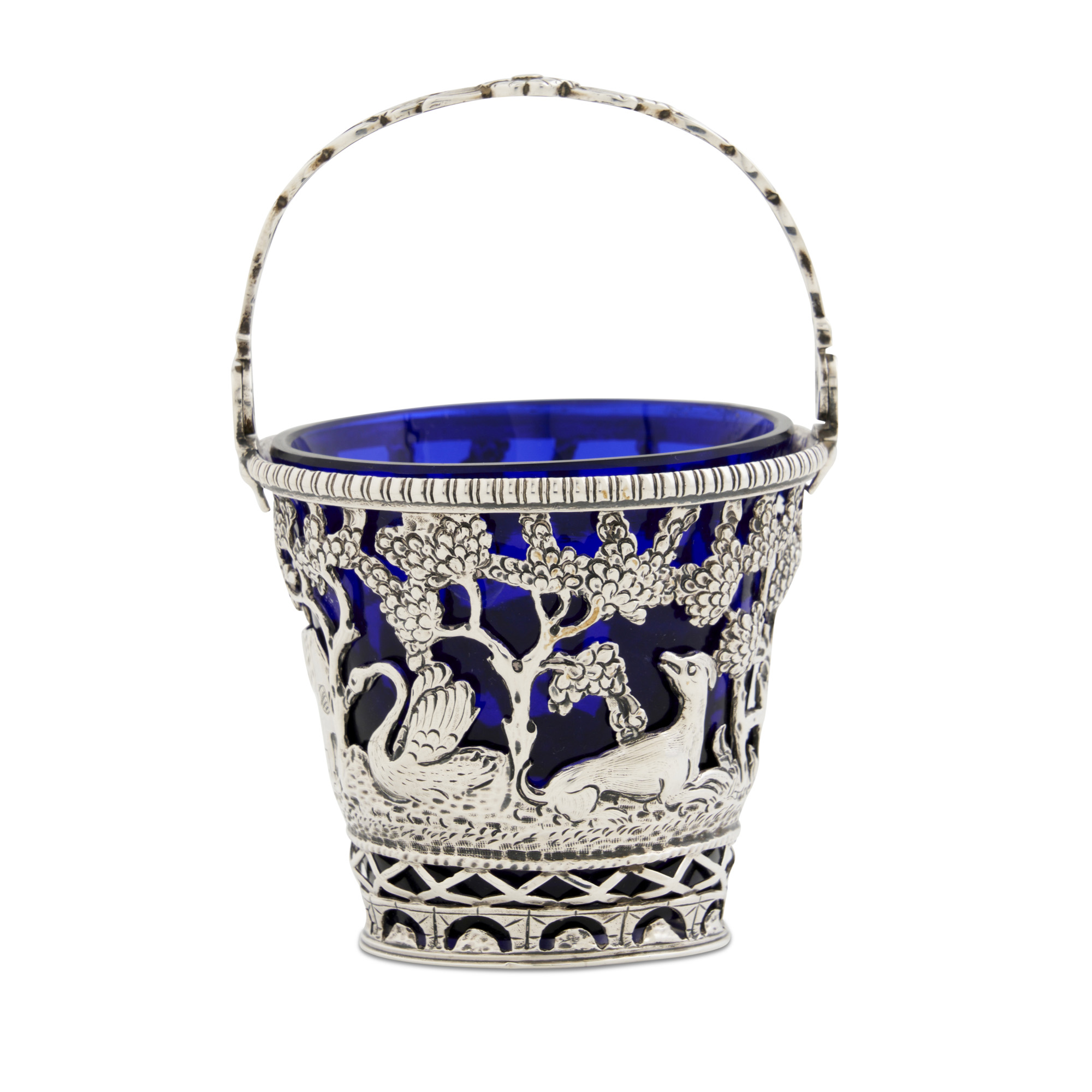Of tapering cylindrical shape with a swing handle, the gadrooned rim above the openwork sides modelled as buildings, animals, and a swan beneath trees, with a blue glass liner