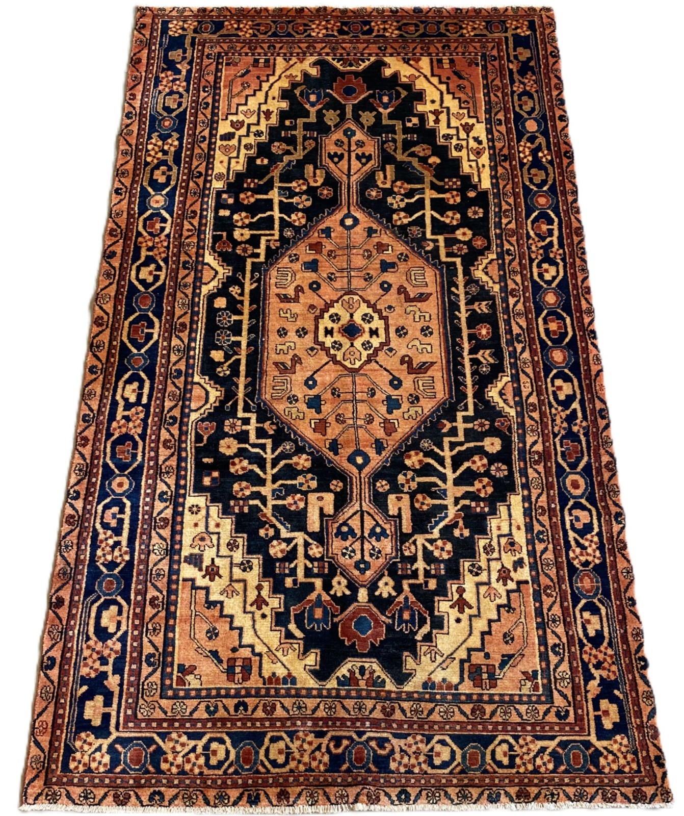 VEGETABLE DYES HAND-KNOTTED VILLAGE WEAVE FROM THE HAMADAN REGION WITH A DISTINCT DESIGN OF CENTRAL HEXAGONAL ANCHORED MEDALLION CONTAINING FLORAL PATTERNS & CORNER MEDALLIONS IN A CHARCOAL FIELD OF FLORAL PATTERNS. BORDER OF ROSETTES.
