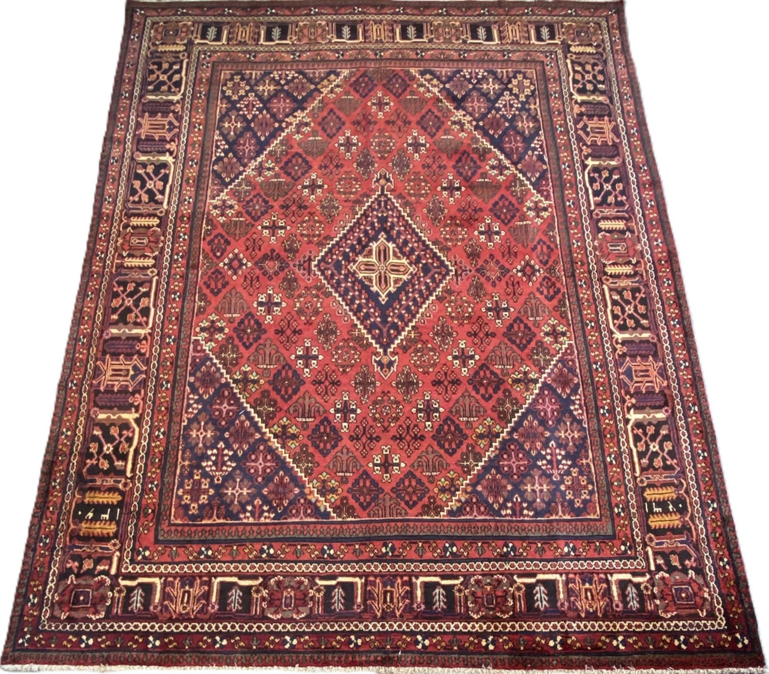HAND-SPUN WOOLLEN PILE & NATURAL DYES. HAND-KNOTTED VILLAGE WEAVE FROM THE ISFAHAN PROVINCE WITH A DISTINCT DESIGN OF A DIAMOND-SHAPED MEDALLION SET AGAINST DIAGONAL ROWS OF STYLIZED FLORAL & TREE OF LIFE PATTERNS SET WITHIN A CRIMSON BACKGROUND. BORDER OF STYLIZED PALMETTES & LEAF FORMS.