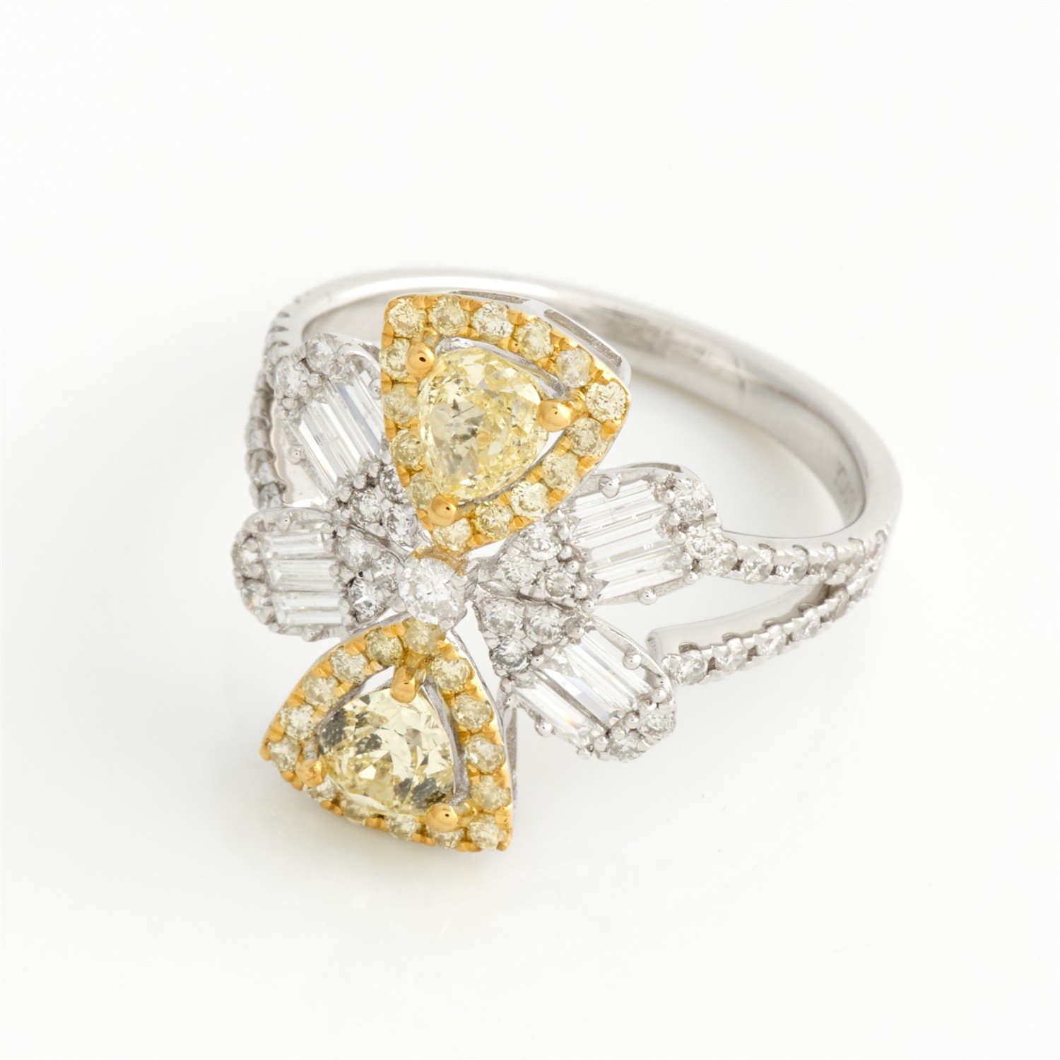 A YELLOW DIAMOND AND DIAMOND RING IN 18CT WHITE GOLD, THE YELLOW DIAMONDS TOTALLING APPROXIMATELY 0.79CTS, THE DIAMONDS TOTALLING APPROXIMATELY 0.66CTS, SIZE N, 3.5GMS