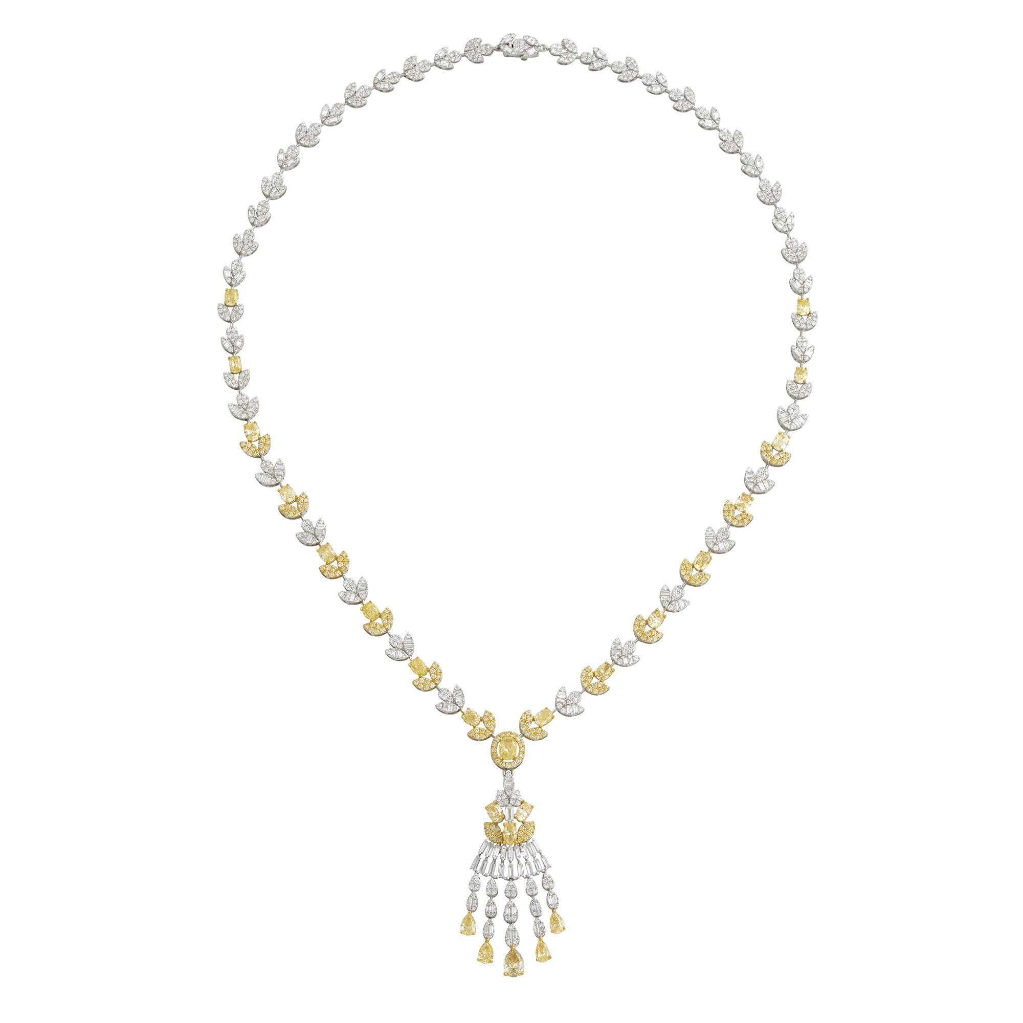 The diamond necklace of alternating yellow and white diamonds in pavé-set floral motif links of graduating diamonds, centring to a claw-set oval modified brilliant-cut diamond, further surrounded by a halo of claw-set fancy yellow diamonds suspended above a detachable pendant of pear shaped , oval and baguette cut diamonds, the diamonds together weighing approximately 13.45 carats, length approximately 450mm, pendant length 60mm, gross weight approximately 24.0 grams.