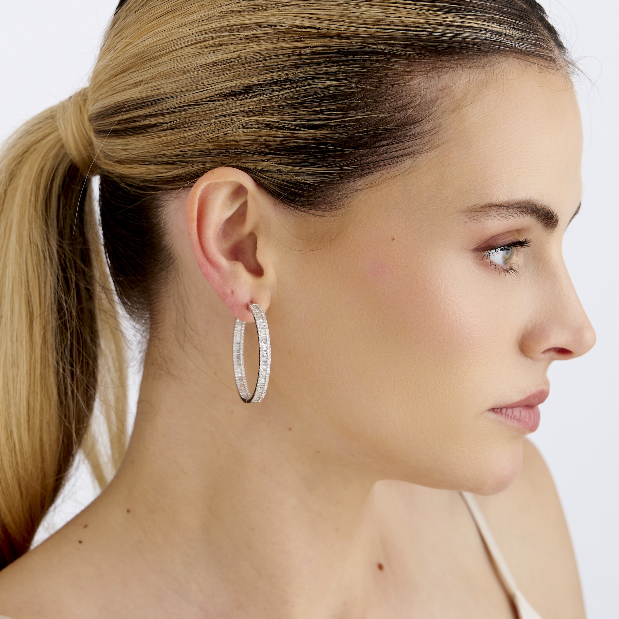 Each comprising a half hoop of front-facing diamonds as two rows of claw-set round brilliant-cut diamonds with a centre row of end-set baguette-cut diamonds, to a post and an integrated clip, the diamonds together weighing approximately 2.50 carats, inner diameter approximately 37mm, width approximately 4.33mm, gross weight approximately 16.0 grams.