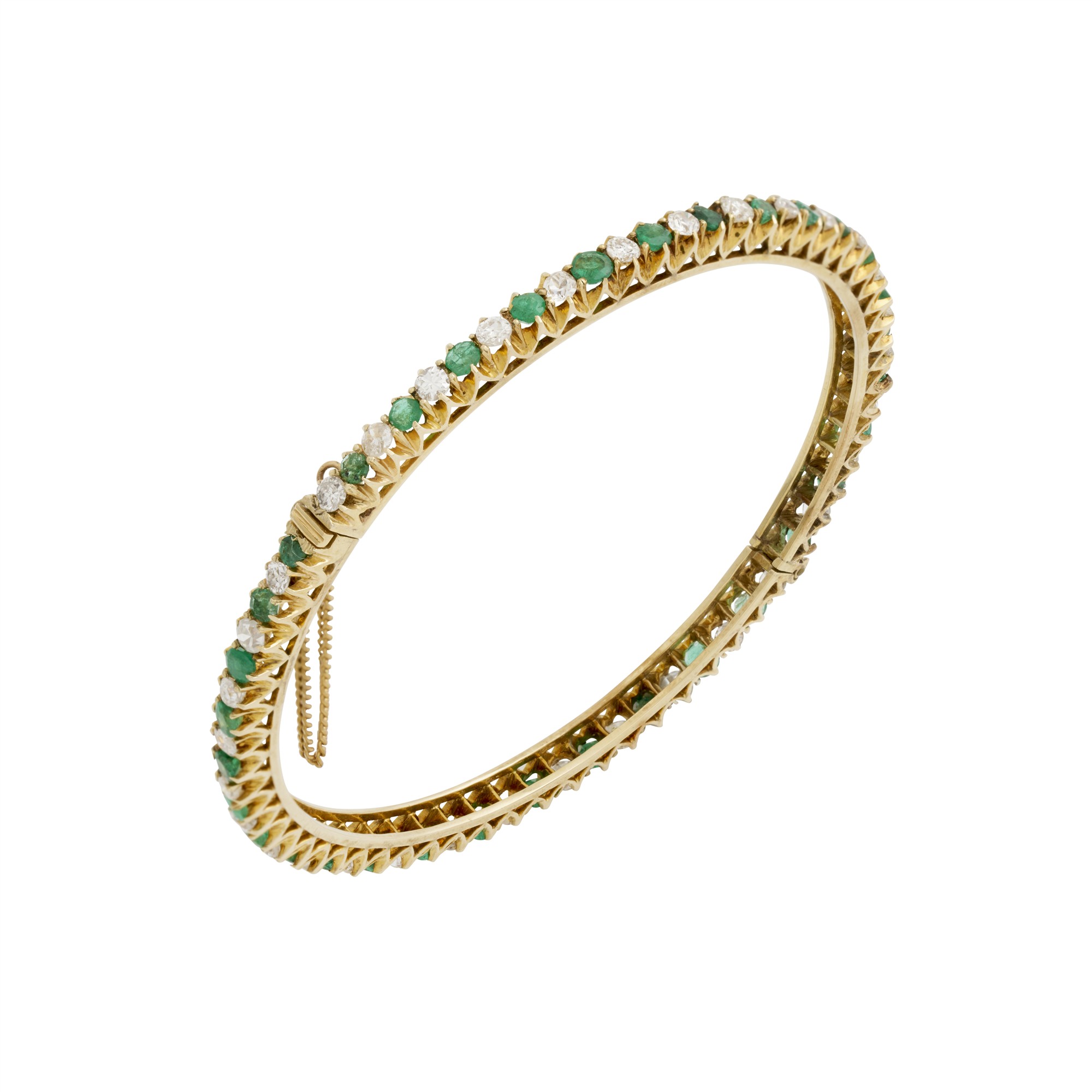 A round hinge bangle of alternating claw-set oval cut emeralds and old-cut round diamonds to a box clasp with safety chain, the diamonds together weighing approximately 1.02 carats, internal diameter approximately 155mm, gross weight approximately 13.4 grams.