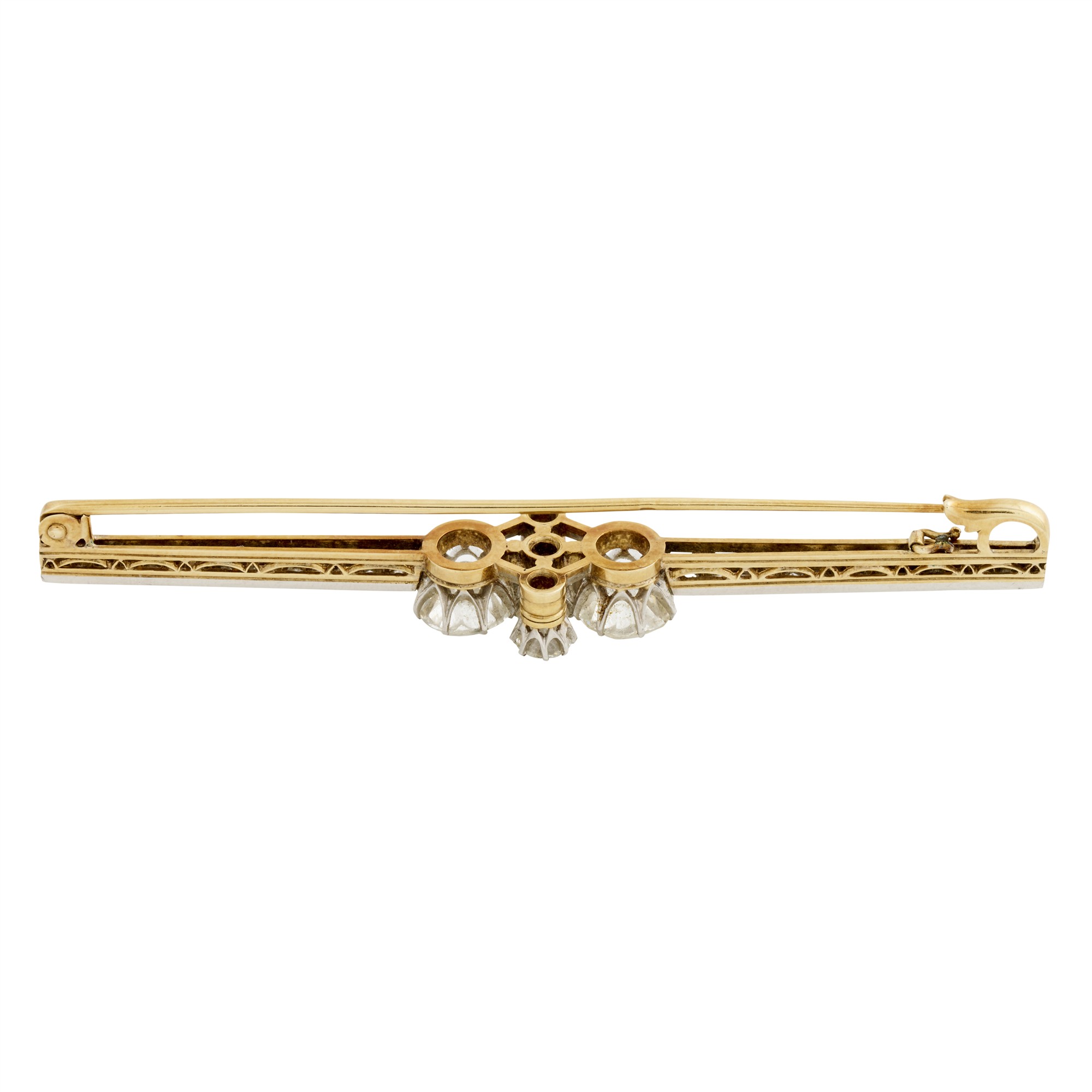 Centring two claw-set old-cut diamonds each weighing approximately 2.40 carats and 2.32 carats, aside a cluster of two claw-set round old-cut diamonds and one old-cut cushion cut diamond, to a bar of channel-set round old-cut diamonds with a filligree openwork mount to a pin and catch, with a total diamond weight of approximately approximately 6.40 carats, length approximately 80mm, gross weight approximately 8.0 grams.