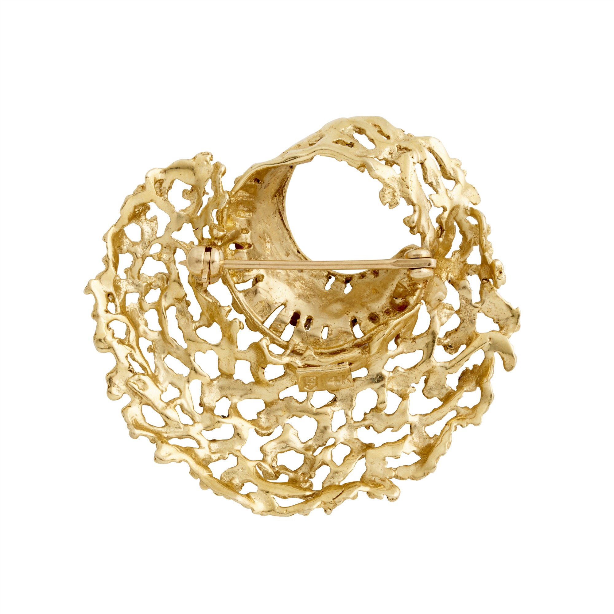 Comprising a scroll of openwork textured coral motifs with five claw-set round rubies to a roll clasp and pin, width approximately 40mm, gross weight approximately 8.2 grams.