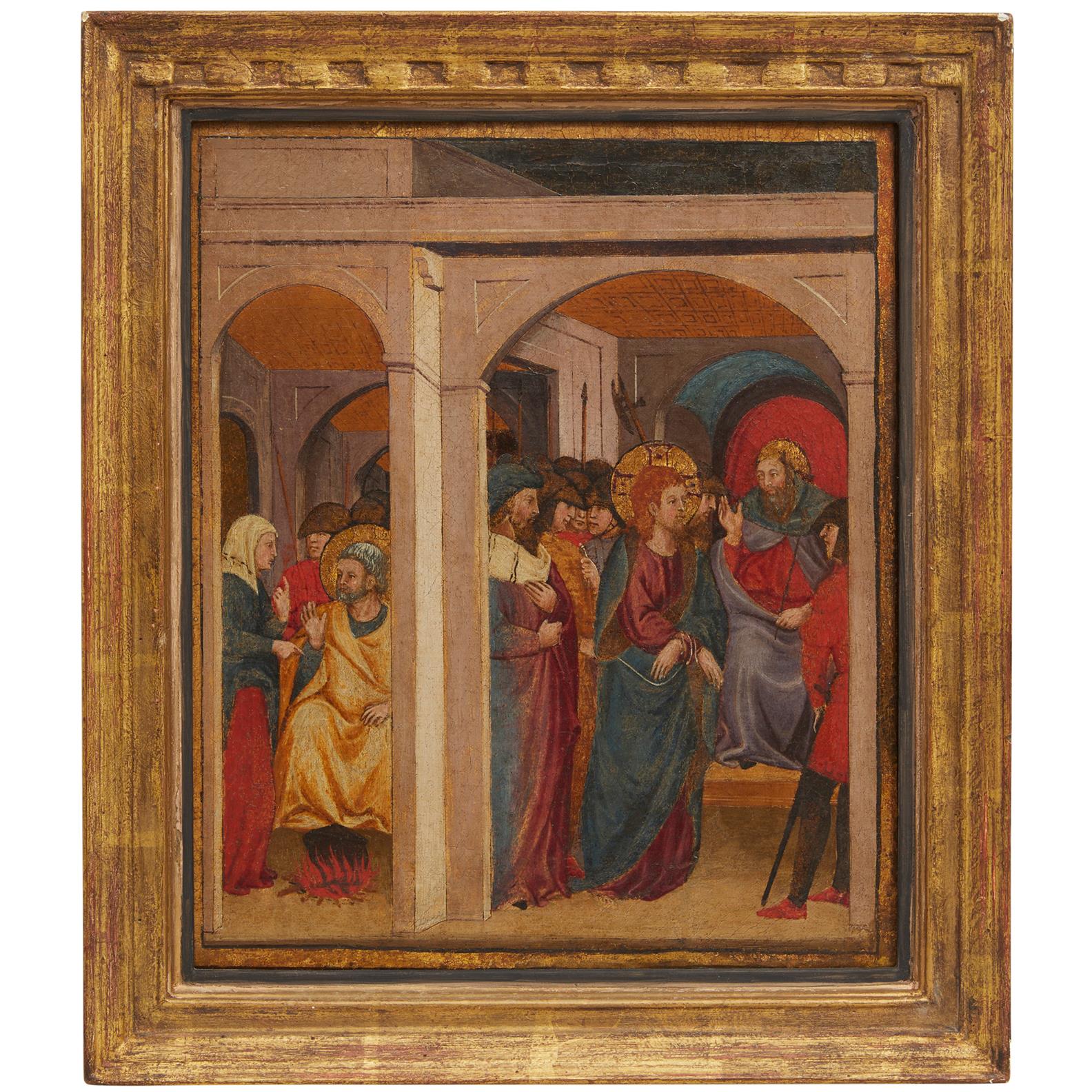 This panel, representing two scenes, would have originally formed part of a 'predella', some of whose other constituent parts were first recognised by Federico Zeri. Zeri identified four other related panels by Schiavo, of almost identical size and also representing scenes from the Passion; two in the Kress Collection 'The Flagellation' and 'The Crucifixion' (K216, Museo de Arte de Ponce, Puerto Rico; and K1188, University of Georgia, Athens, GA; see F.R. Shapley, Paintings from the Samuel H. Kress Collection. Italian Paintings XIII-XV Century, London, 1966, p. 105, figs. 281-2); 'The Betrayal of Christ' (private collection, Florence); and 'The Resurrection' (formerly in the collection of Willard Golovin and sold at Sotheby's, New York, 23 January 2003, lot 176). Professor Miklós Boskovits added a further panel, the 'Agony in the Garden', previously unpublished (private collection, see Boskovits, op. cit., pp. 336 and 339, fig. 8). He considers these panels to possibly be part of the same paliotto, and dates them to around 1435-1440.