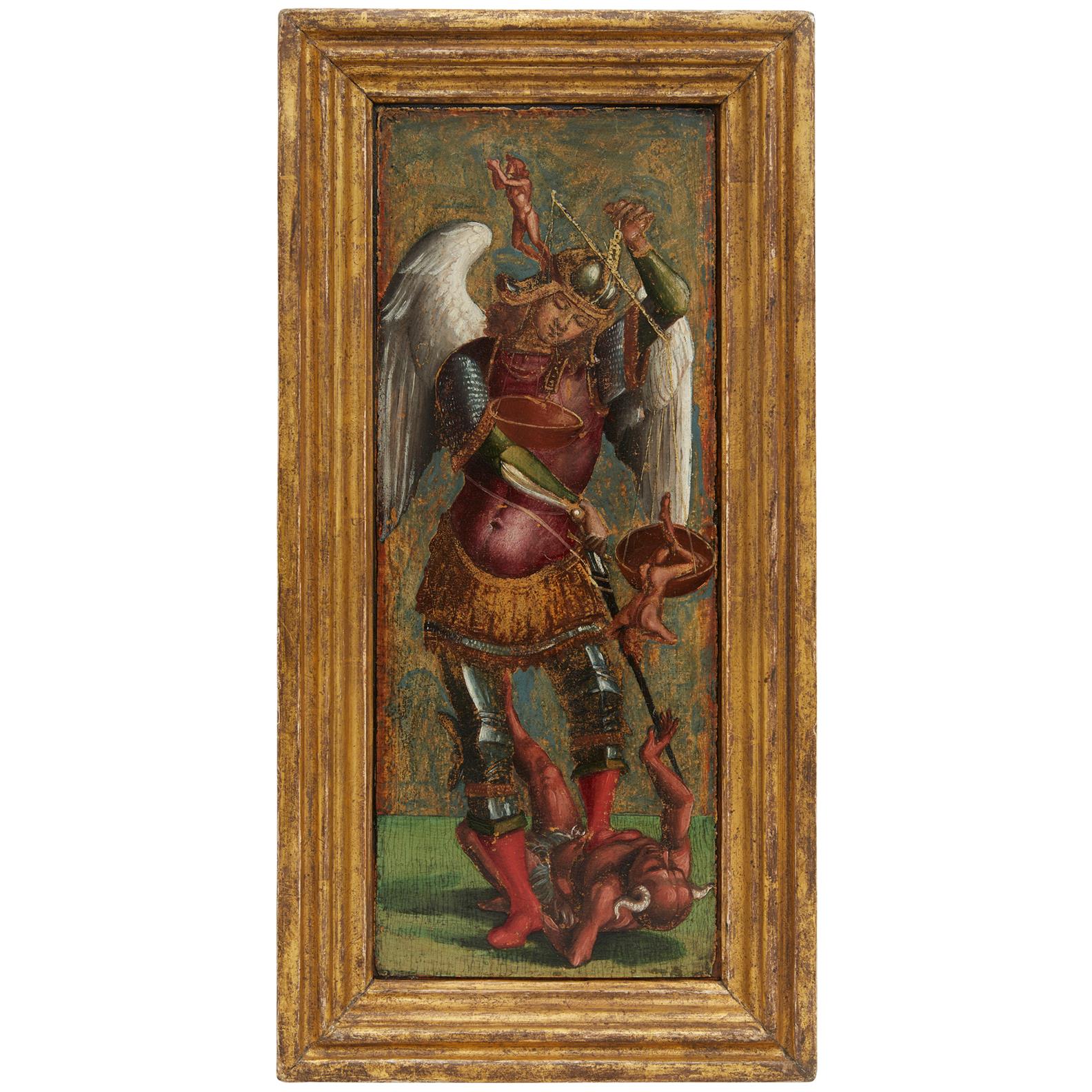This panel depicting Saint Michael has been plausibly identified by Kanter as originating from one of the pilasters flanking Luca Signorelli's celebrated Lamentation at the Foot of the Cross (also known as Lamentation over the Dead Christ), commissioned for the high altar of Santa Margherita in Cortona and completed in 1502.(1) The altarpiece, now housed in the Diocesan Museum of Cortona, is widely regarded as Signorelli's most distinguished commission and a pinnacle of his artistic output for his native town.