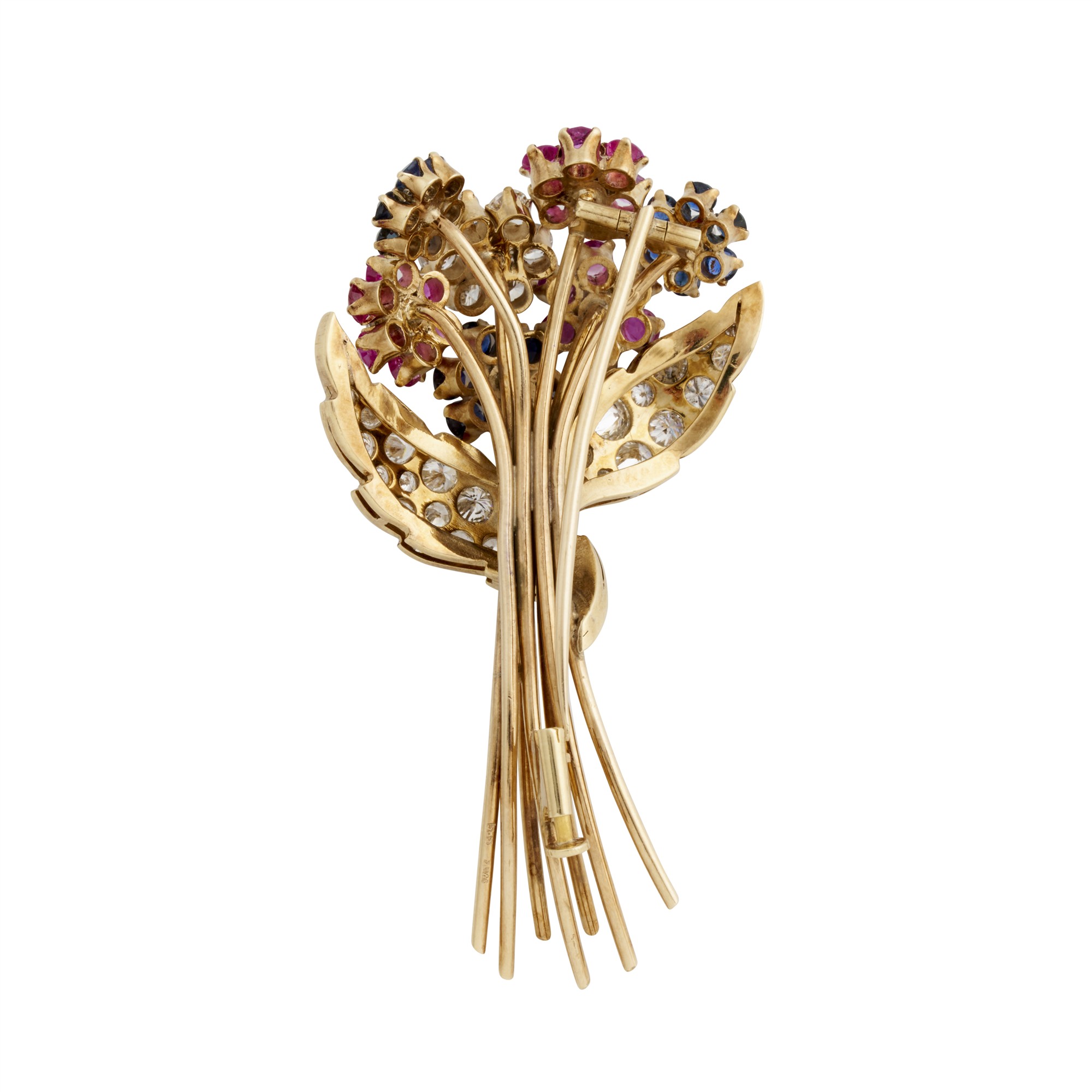 A sapphire, ruby and diamond brooch in floral motifs as a bouquet with diamond encrusted folia and a spray of gold stems to a push clasp, the rubies and sapphires together weighing approximately 3.00 carats, the diamonds together weighing approximately 4.00 carats,
