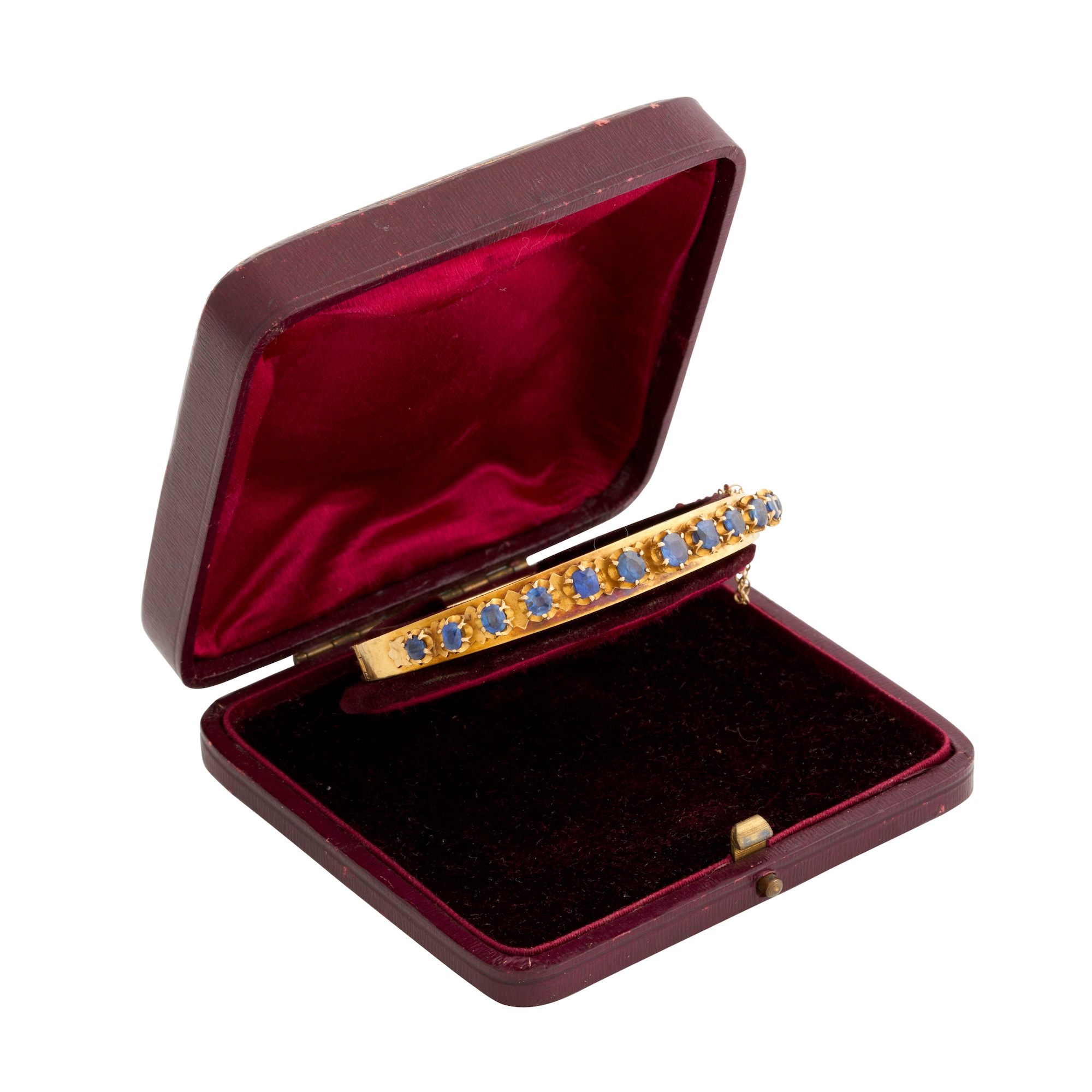 Of oval hinged design, the top claw-set with circular-cut sapphires together weighing approximately 2.50 carats, completed by a tongue and groove clasp and safety chain, inner diameter 60mm, gross weight approximately 22.2 grams.