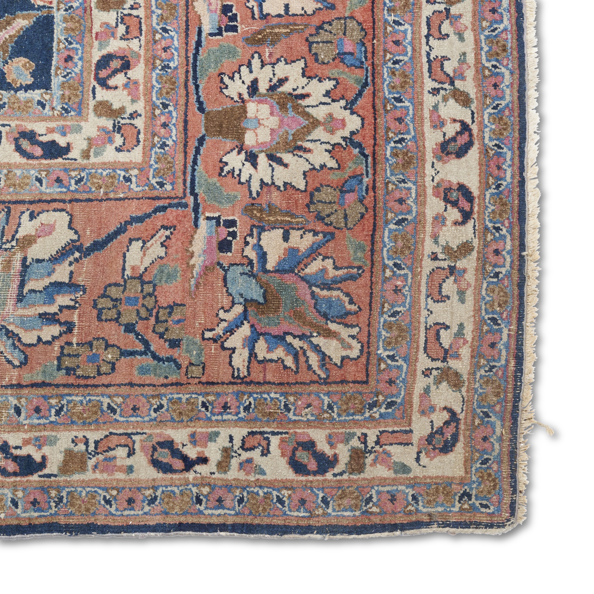 General wear throughout but with various areas of more pronounced wear to the pile exposing the warp and weft; a noticeable variation between the two halves in the colour of the pink parts (abrash?), divided roughly along the centre line; other more minor variations in colour.