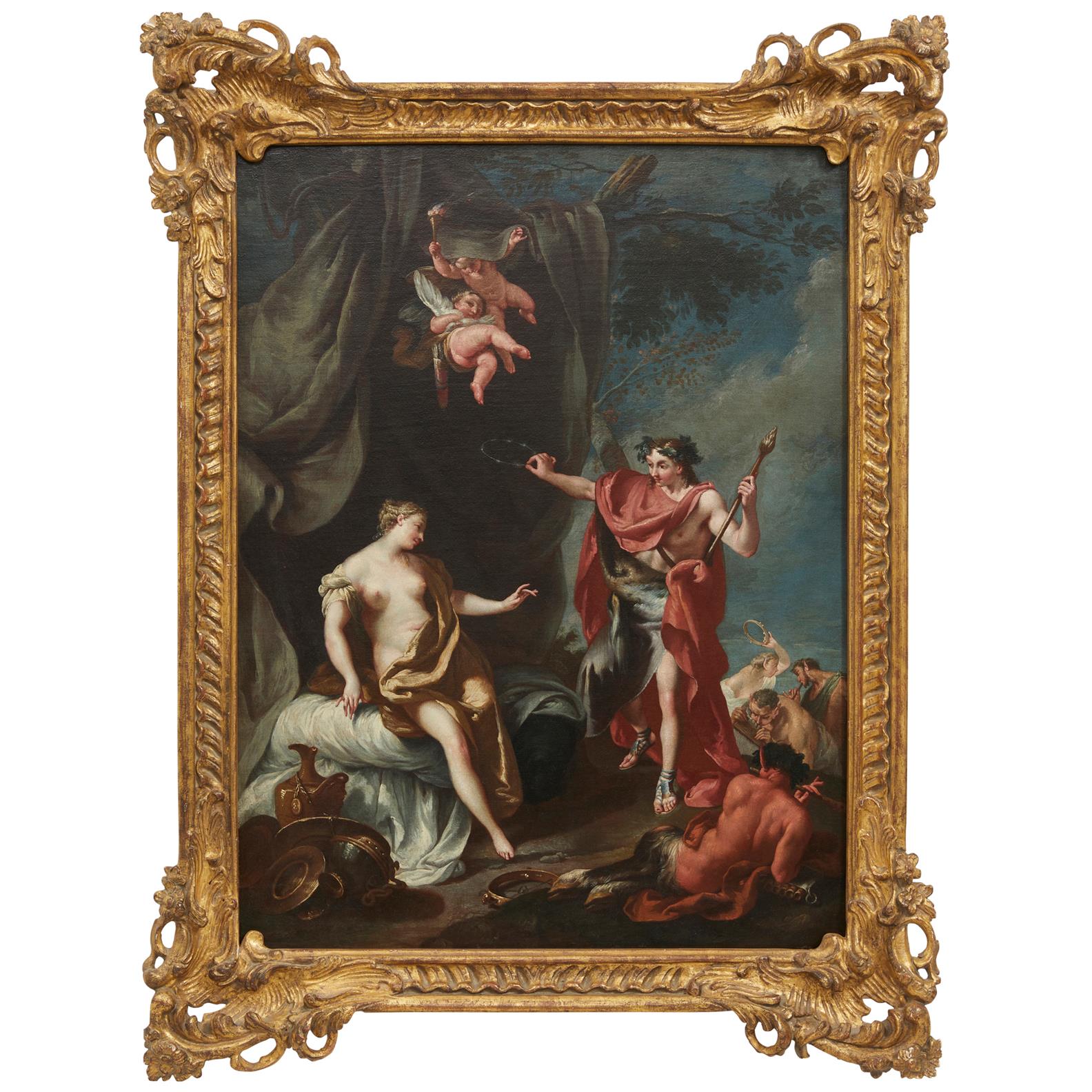 In an Arcadian setting, Ariadne, abandoned by Theseus, is approached by Bacchus with his court of Satyrs and drunken followers dancing to the sound of fipple, flutes and tambourines. The skin beneath his red cloak alludes to the cheetahs that usually draw his chariot, while Ariadne's crown is the crown which the god cast into the sky in order to turn her into a constellation.