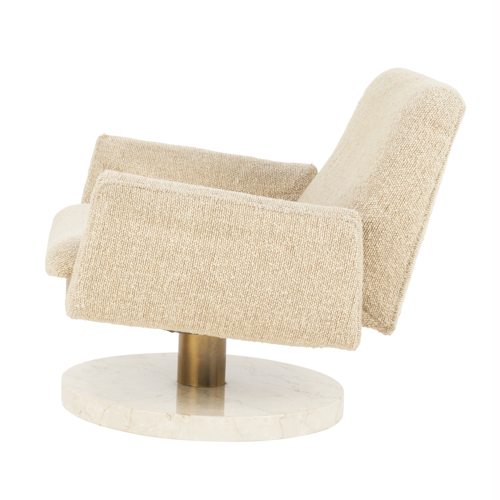 Original cream boucle upholstery on polished brass and solid marble swivel pedestal base.