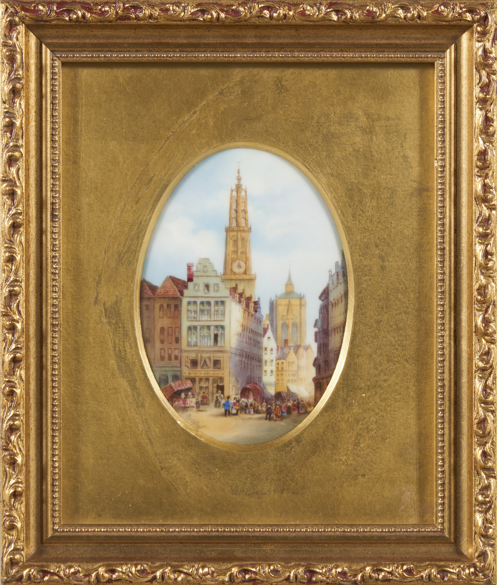 Convex, respectively titled 'Brussels, the Hotel de Ville' and 'The Cathedral, Antwerp', each signed, printed factory marks and painted titles to the reverse, mounted and framed behind glass