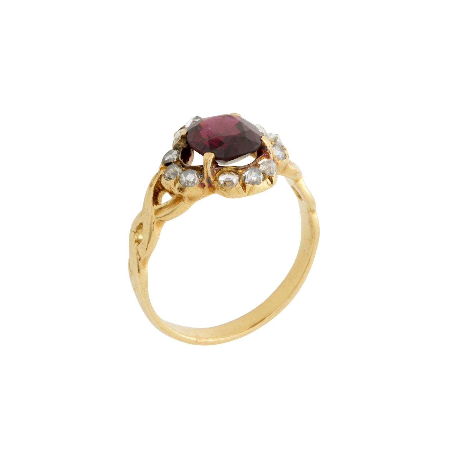 Centring a claw-set cushion-cut garnet within a frame of claw-set rose-cut diamonds, to intertwined shoulders, mounted in 18ct gold, size O, gross weight approximately 4.1 grams.