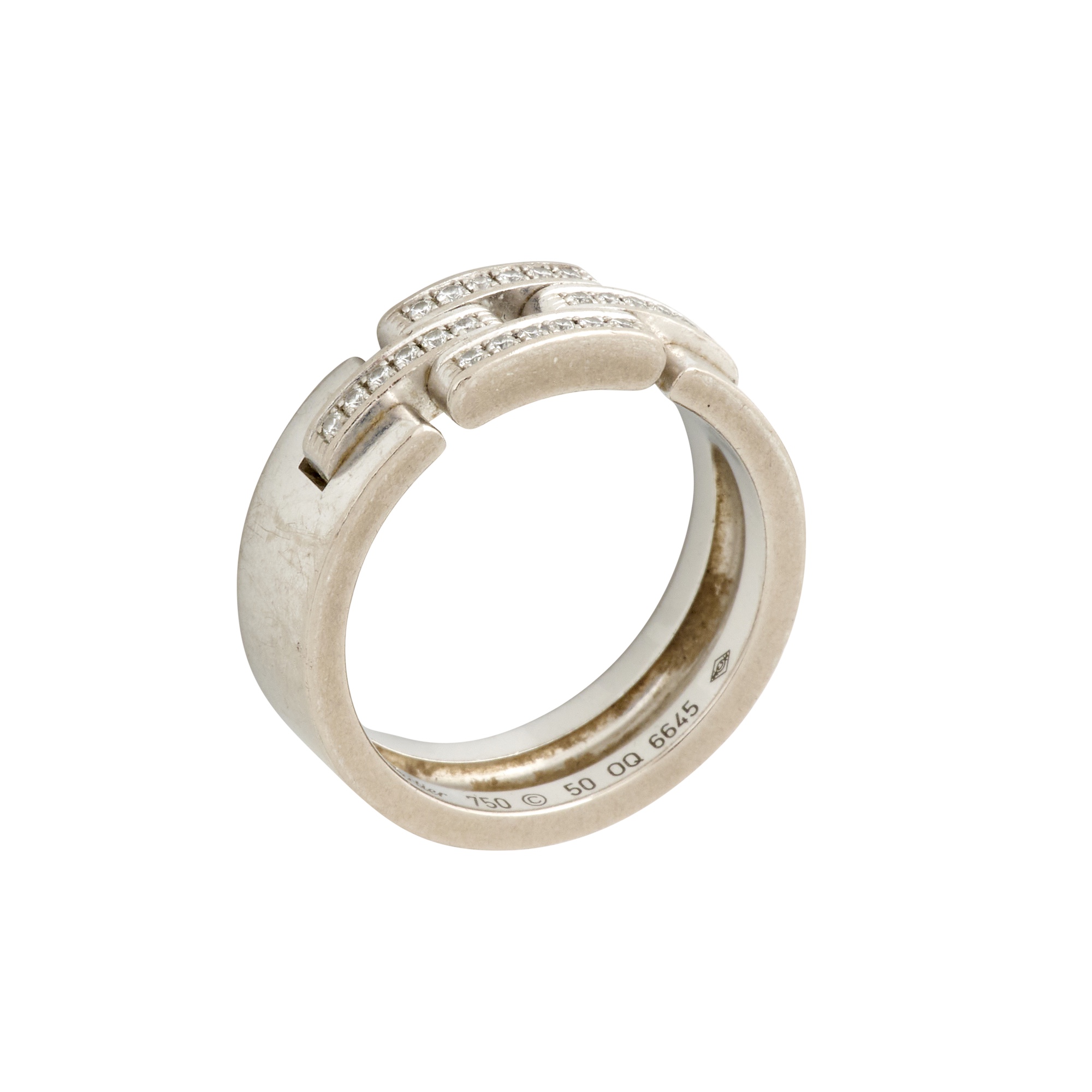 The wide band centring an open geometric motif grain-set with round brilliant-cut diamonds, signed Cartier, numbered OQ6645, size K(50), gross weight approximately 8.1 grams.