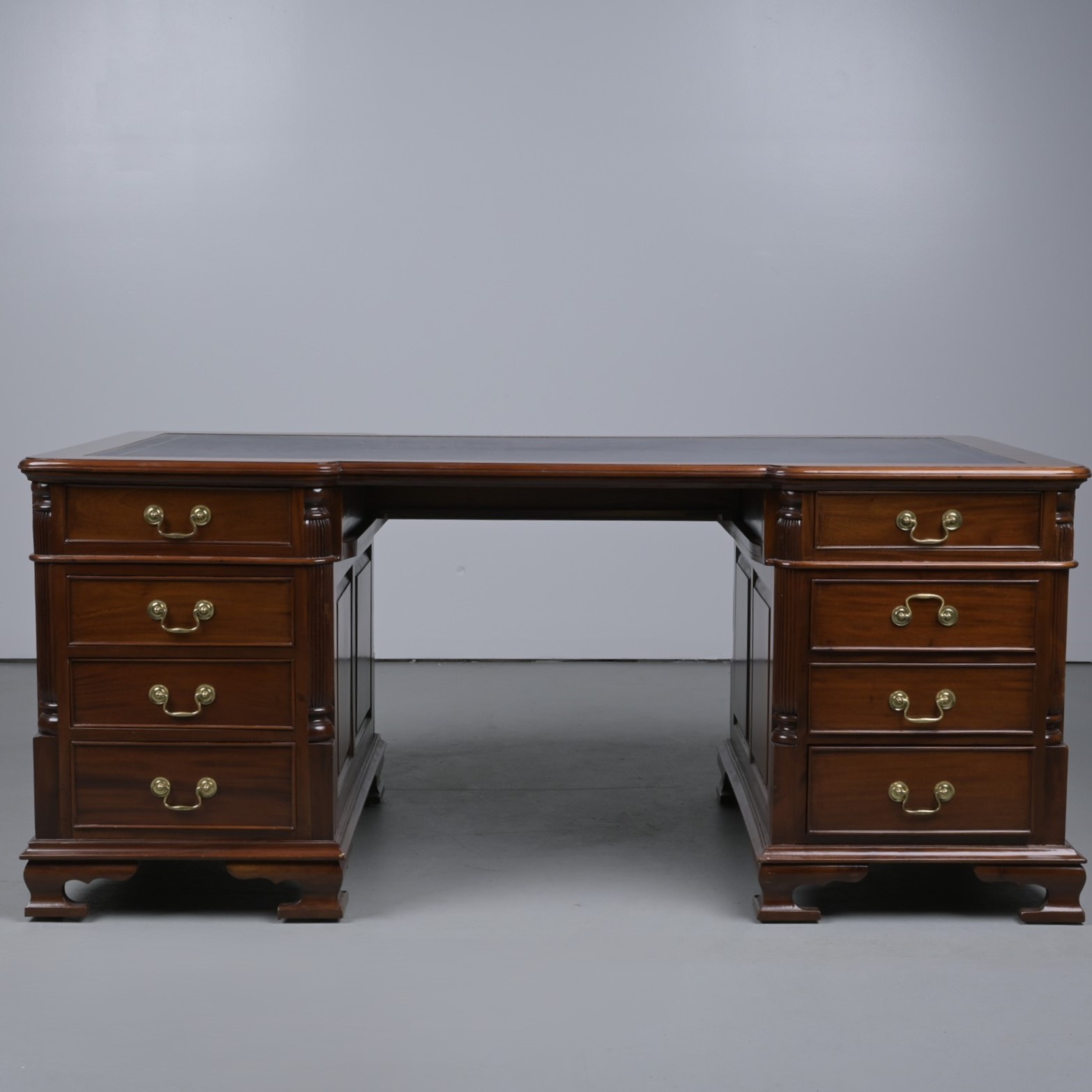 A MAHOGANY PEDESTAL DESK IN ANTIQUE MANNER, THE TOP LEATHER LINED (79CM H X 180CM W X 95CM D) (THIS ITEM MUST BE REMOVED BY PROFESSIONAL CARRIERS OR CLIENTS. LEONARD JOEL STAFF CANNOT ASSIST WITH CARRYING OR DELIVERY OF THIS ITEM)