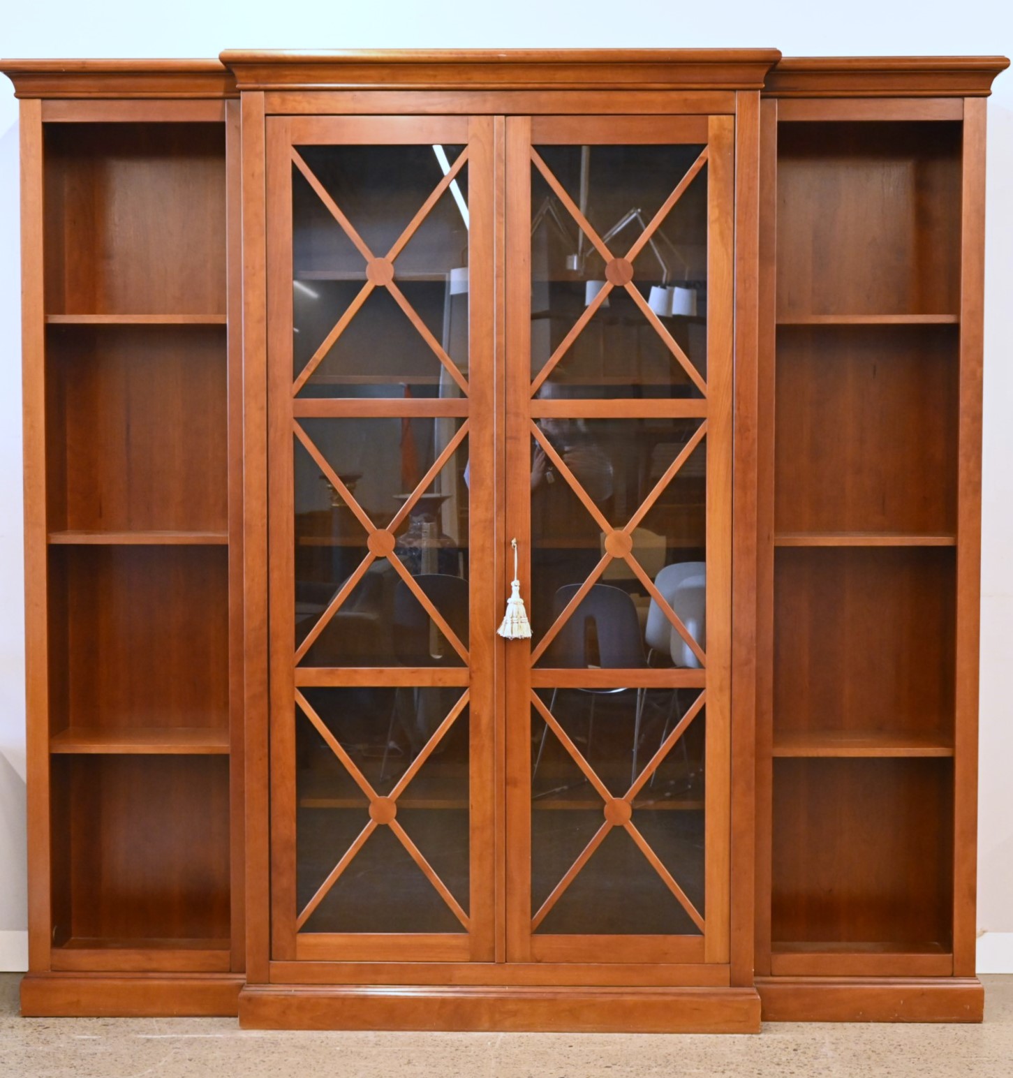 A HARDWOOD BREAKFRONT BOOKCASE CABINET FOR GRANGE (213CM H X 220CM W X 46CM D) (THIS ITEM MUST BE REMOVED BY PROFESSIONAL CARRIERS OR CLIENTS. LEONARD JOEL STAFF CANNOT ASSIST WITH CARRYING OR DELIVERY OF THIS ITEM)