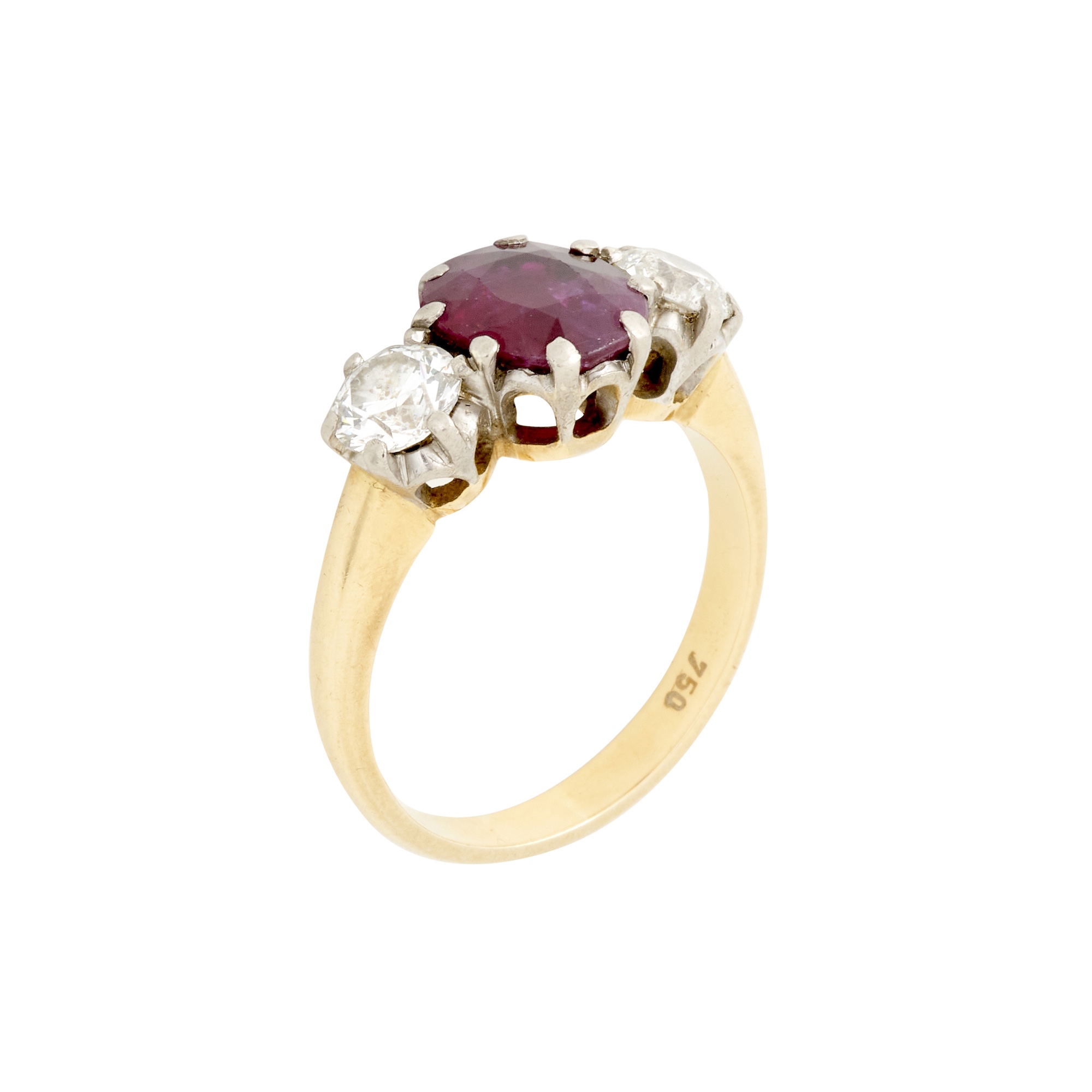 Centring a claw-set oval-cut ruby weighing approximately 3.03 carats, flanked by claw-set round brilliant-cut diamonds together weighing approximately 1.24 carats, size Q½, gross weight approximately 6.5 grams.