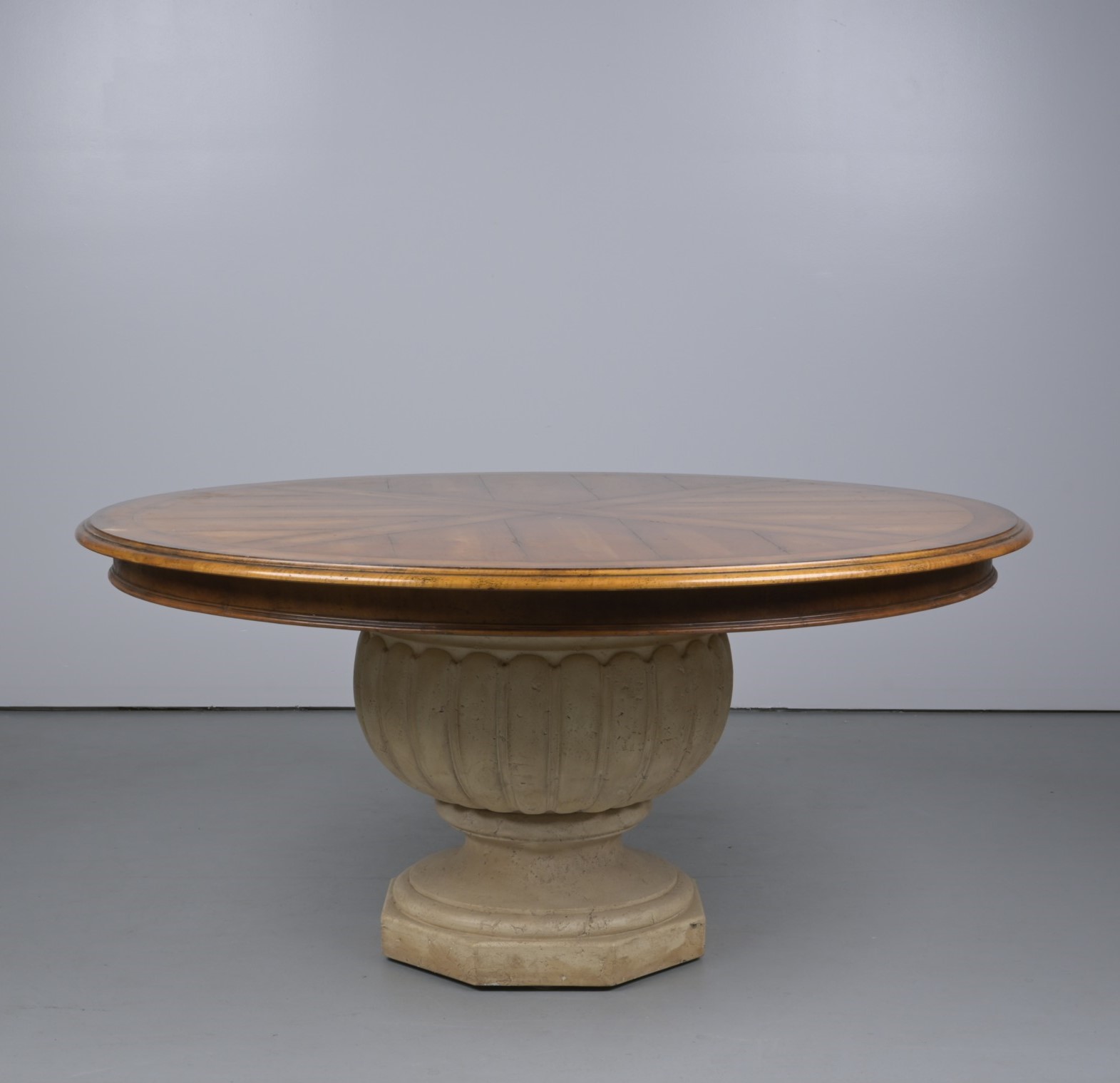 A CIRCULAR CHERRY WOOD AND RECONSTITUTED STONE DINING TABLE (A/F) (80CM H X 163CM DIA) (THIS ITEM MUST BE REMOVED BY PROFESSIONAL CARRIERS OR CLIENTS. LEONARD JOEL STAFF CANNOT ASSIST WITH CARRYING OR DELIVERY OF THIS ITEM)