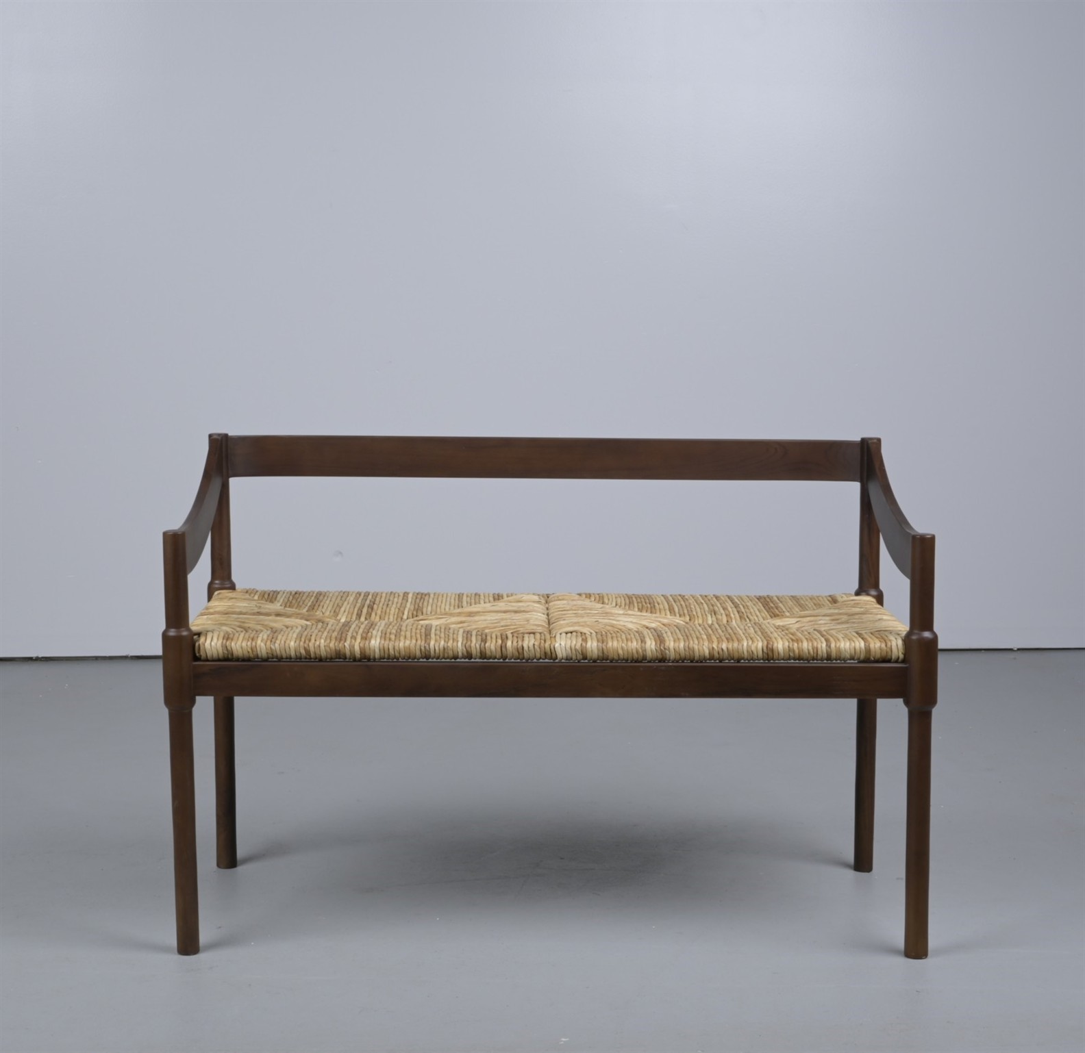 A TEAK AND WOVEN SEAGRASS SEAT (75CM H X 113CM W X 48CM D)