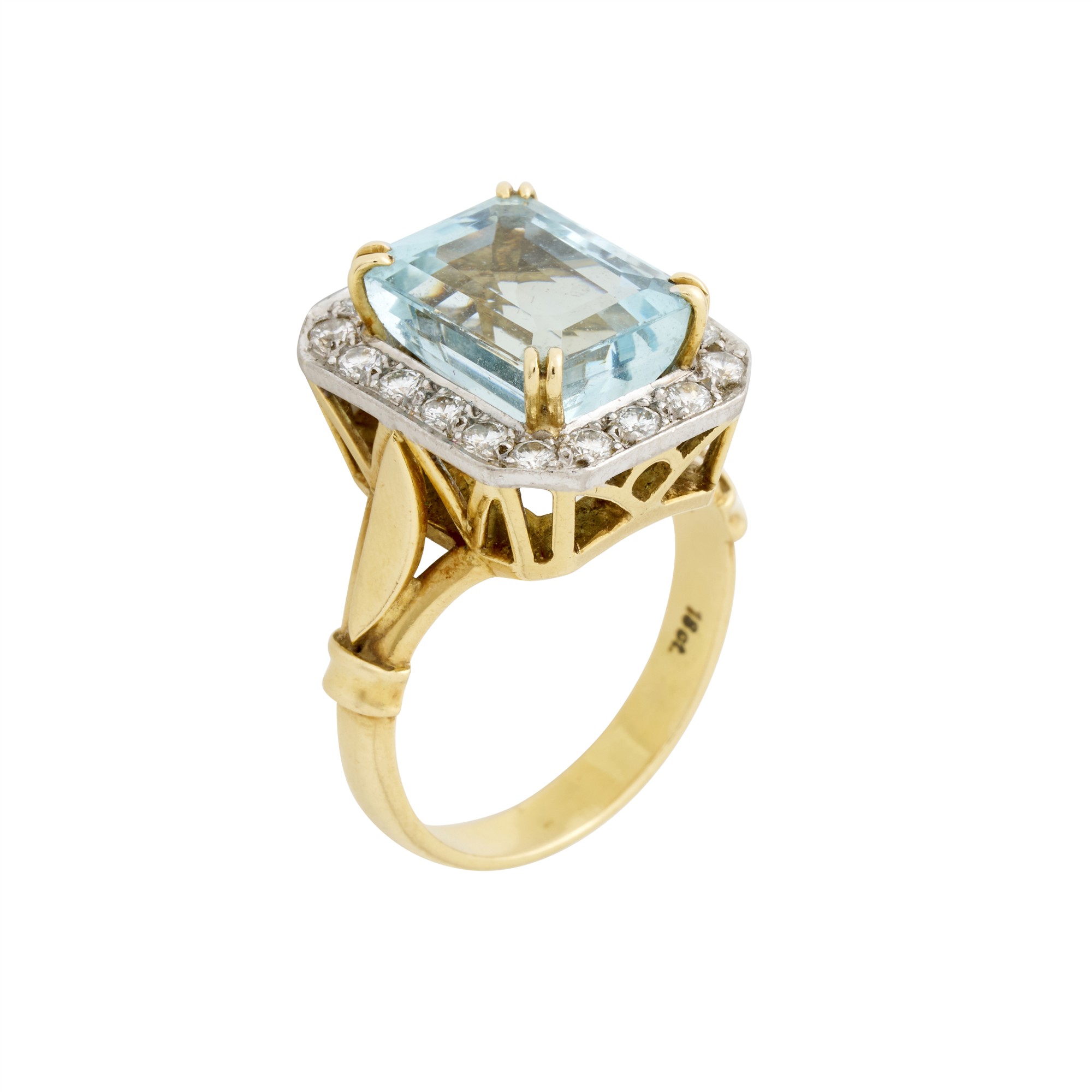 Centring a double claw-set step-cut aquamarine weighing approximately 3.50 carats, surrounded by a claw-set halo of eighteen european-cut round diamonds, to a raised gallery setting on a split band with detailed shoulders, the diamonds together weighing approximately 0.45 carats, size P1/4, gross weight approximately 9.8 grams.