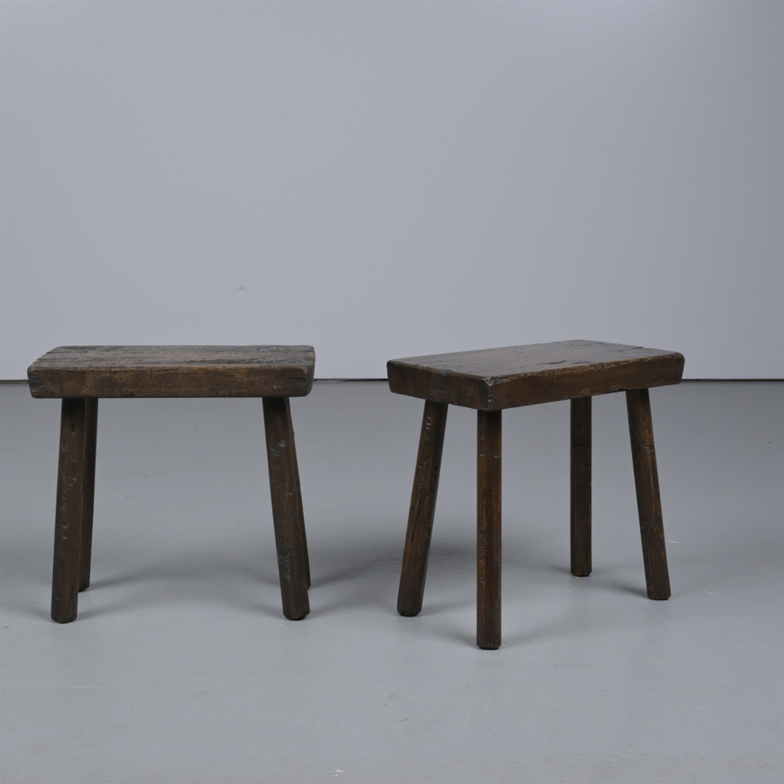 A PAIR OF FRENCH- STYLE OAK MILKING STOOLS (39CM H X 40CM W X 23CM D)