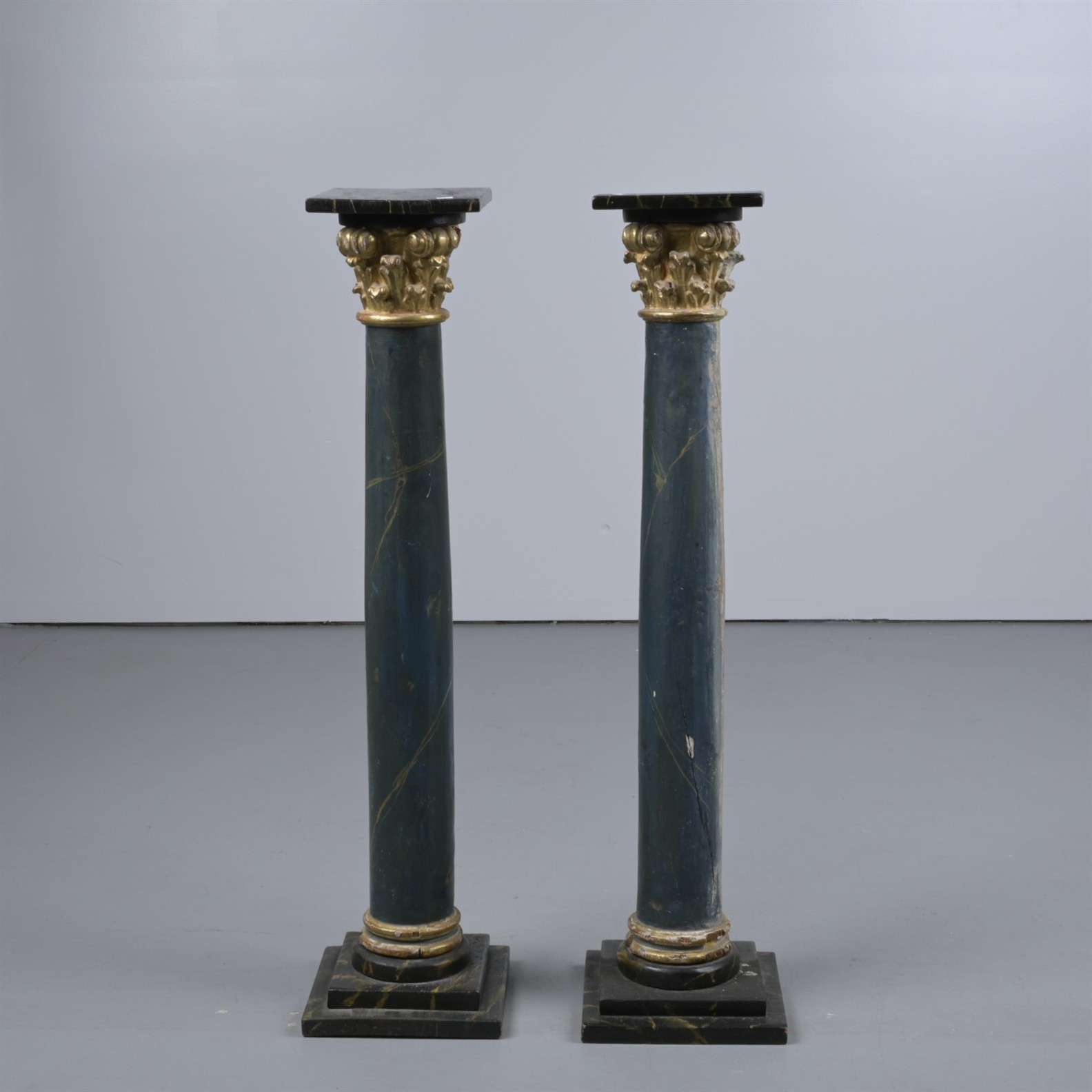 A PAIR OF 19th CENTURY CARVED AND DECORATED WOODEN PEDESTALS IN THE FORM OF CORINTHIAN COLUMNS (120CM H X 24CM W X 24CM D) (THIS ITEM MUST BE REMOVED BY PROFESSIONAL CARRIERS OR CLIENTS. LEONARD JOEL STAFF CANNOT ASSIST WITH CARRYING OR DELIVERY OF THIS ITEM)
