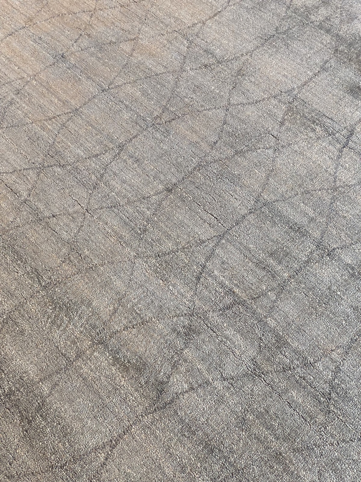 HANDMADE LOOM KNOT & SILK TEXTURE PILE. MODERN DESIGN OF ALL-0VER DISTRESSED LATTICE-SHAPED PATTERNS IN SHADES OF GREY & CHARCOAL.