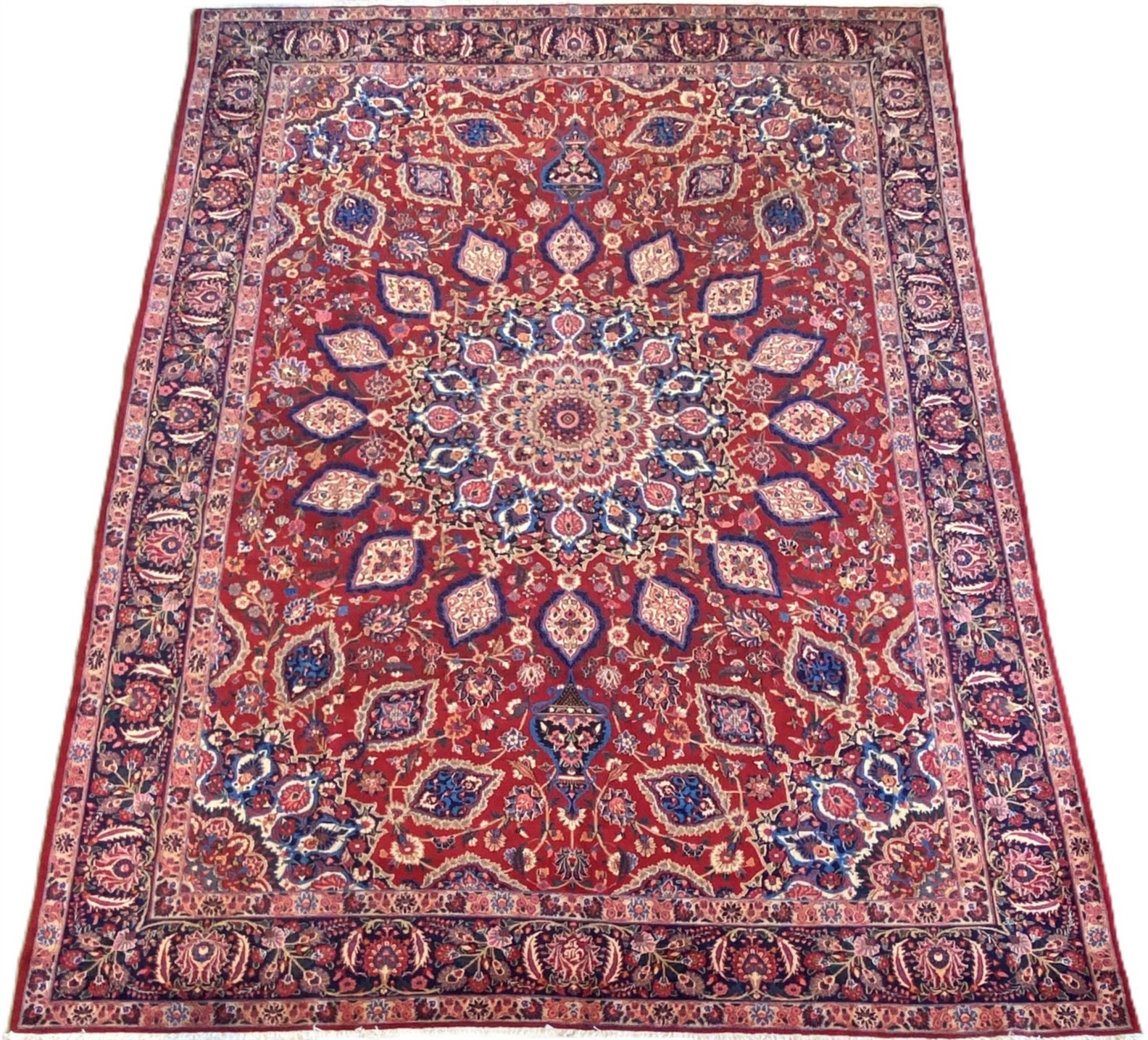 WOOLLEN PILE. FINELY HAND-KNOTTED "GHOLAMI" ATELIER WEAVE OF APPROXIMATELY 450,000 KNOTS PER SQUARE METER FROM THE NORTH-EASTERN KHORASAN PROVINCE WITH A UNIQUE DESIGN OF A STRIKING BOLD FLORAL SUNBURST MEDALLION & QUARTERED CORNER MEDALLIONS OF PALMETTES IN A FIELD OF SHAH ABBASSI PALMETTES & FLORAL MOTIFS. BORDER OF PALMETTES, TENDRILS & FLORAL SPAYS. THE ENTIRE IN VIBRANT SHADES OF CRIMSON, INDIGO, CERULEAN BLUE, CREAM & FLAMINGO PINK. EX-GALLERY EXHIBITED.