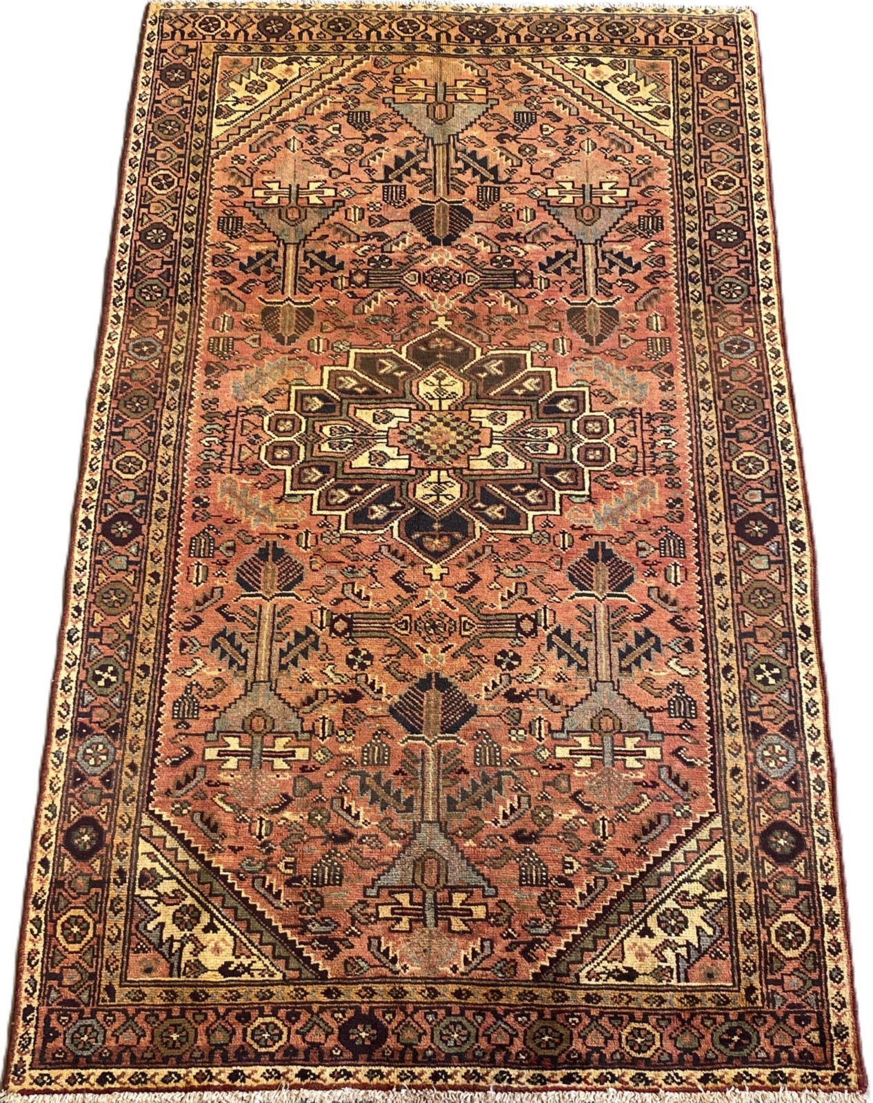 WOOL PILE & VEGETABLE DYES. VILLAGE WEAVE FROM THE HAMADAN REGION WITH DESIGN OF A STYLIZED MEDALLION IN A FIELD OF BOLD HERATI-MAHI PATTERNS & INTRICATE FLORAL & PAISLEY MOTIFS. BORDER OF ROSETTES. THE ENTIRE IN SUBTLE SHADES.