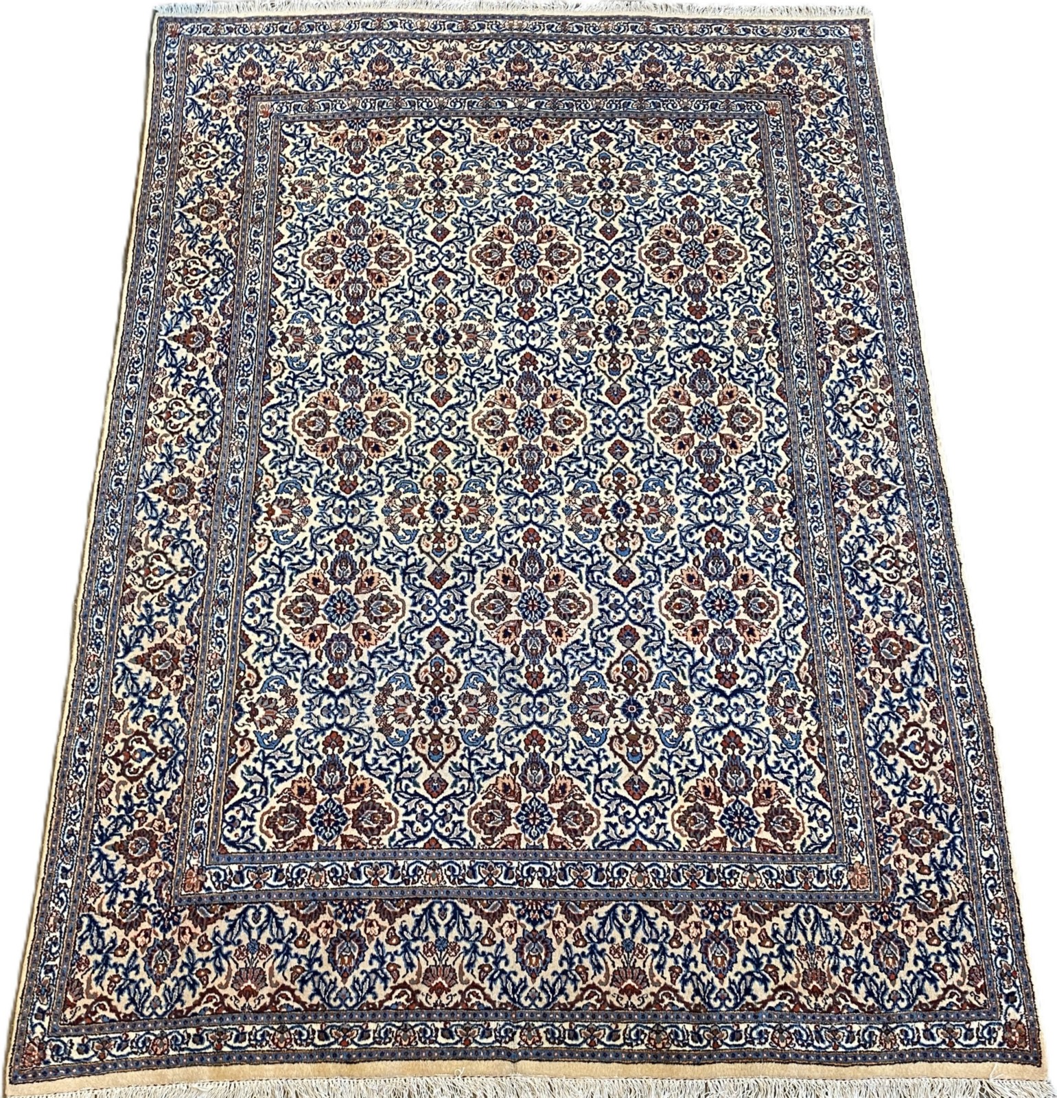 WOOLLEN PILE. FINELY HAND-KNOTTED WEAVE OF APPROXIMATELY 350,000 KNOTS PER SQUARE METER FROM THE NORTH-EASTERN KHORASAN PROVINCE WITH A UNIQUE MINA KHANI DESIGN OF ALL-OVER FLORAL SPRAYS OF PALMETTES IN A FIELD OF RAMBLING TENDRILS. THE ENTIRE IN SHADES OF CREAM, INDIGO, CERULEAN WITH BURGUNDY HIGHLIGHTS. EX-GALLERY EXHIBITED.