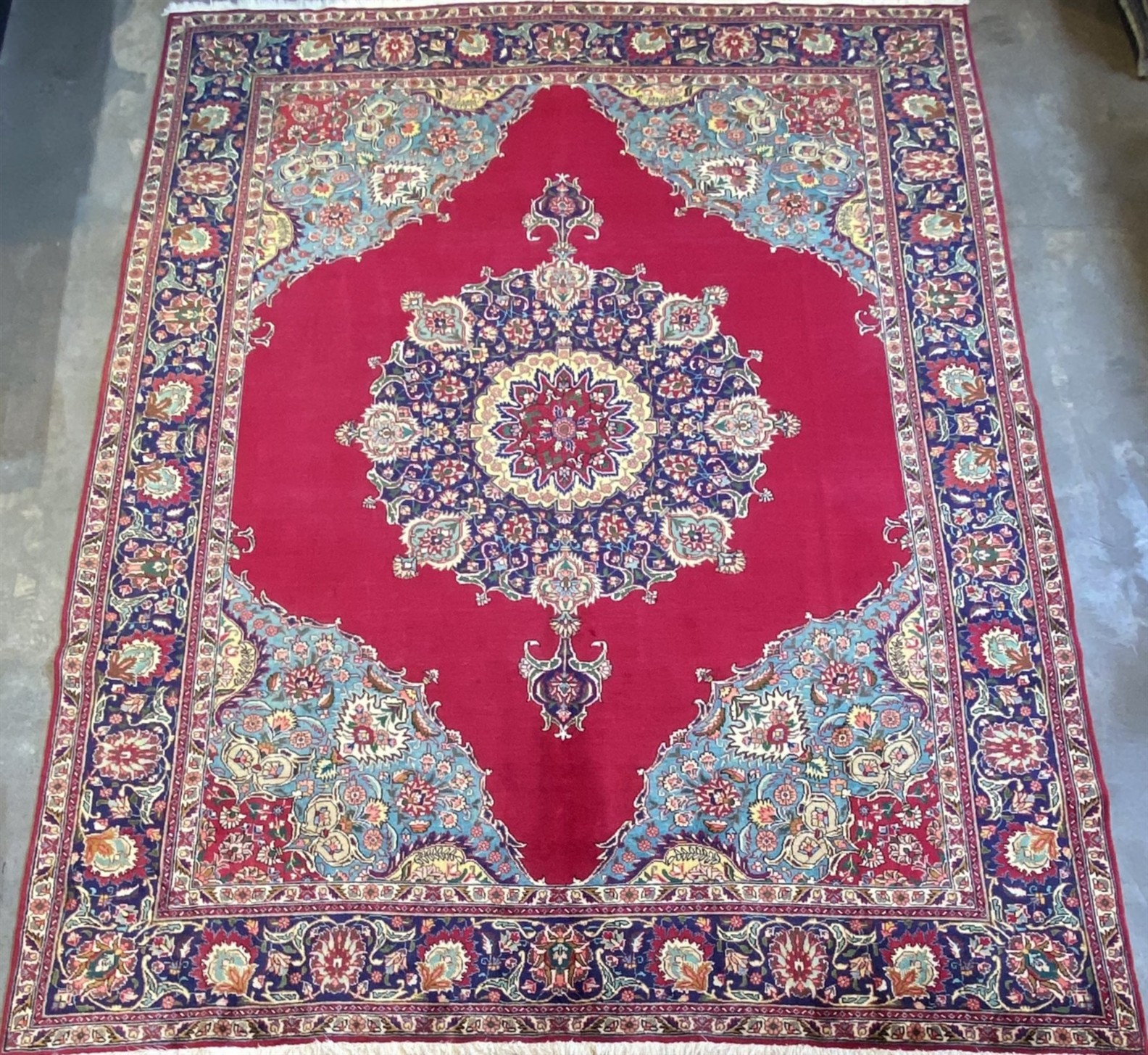 DENSE WOOL PILE AND NATURAL DYES. HAND-KNOTTED CITY WEAVE FROM THE CAPITAL OF AZERBAIJAN PROVINCE WITH CLASSIC ROYAL TABRIZ DESIGN OF A DOMINANT CIRCULAR MEDALLION & QUARTERED CORNER MEDALLIONS IN AN OPEN FIELD. BORDER OF PALMETTES & SAZ LEAVES. THE ENTIRE IN SHADES OF RUBY RED, MIDNIGHT BLUE, SKY BLUE, CREAM & GREEN.