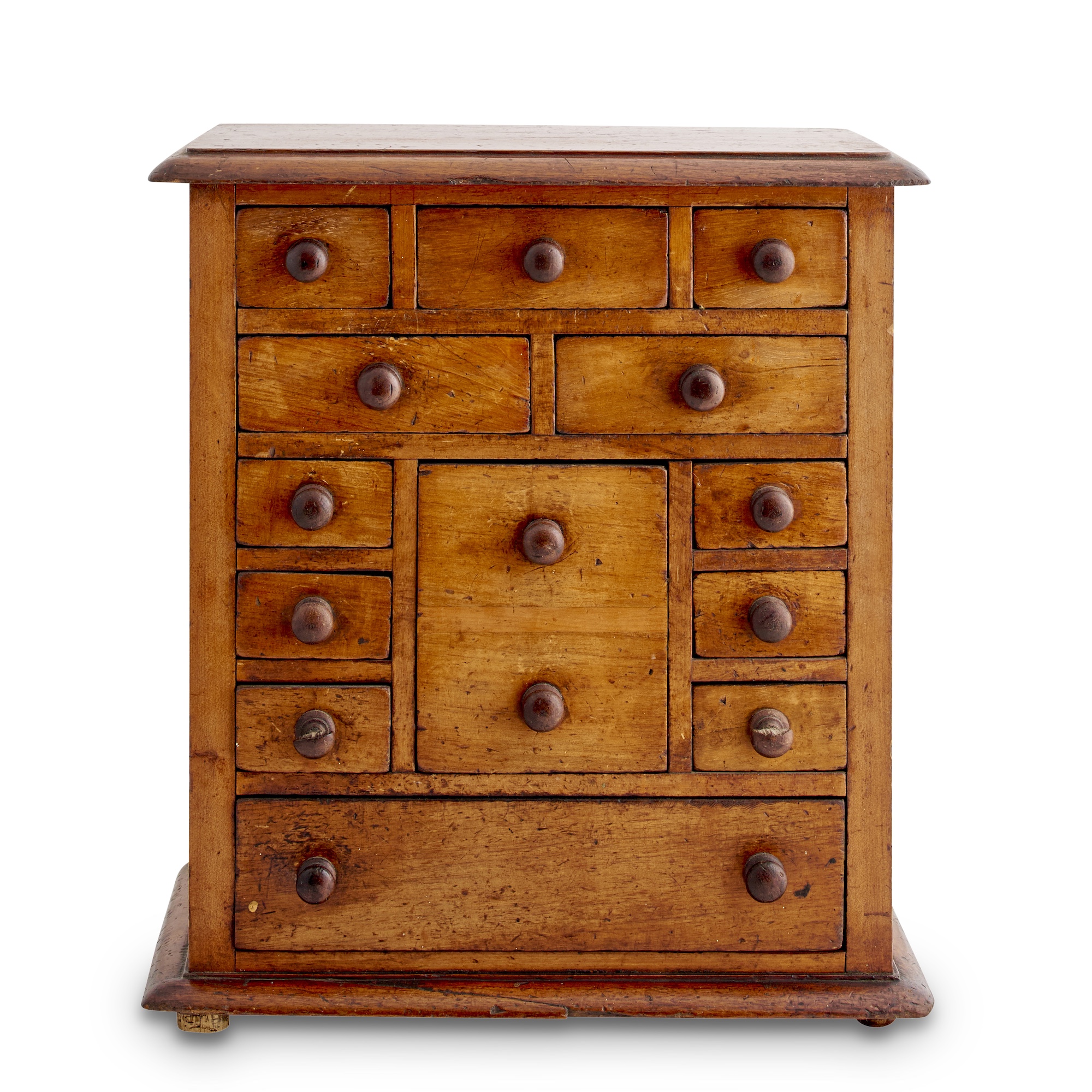 Rectangular, the moulded top above an arrangement of thirteen drawers of various sizes