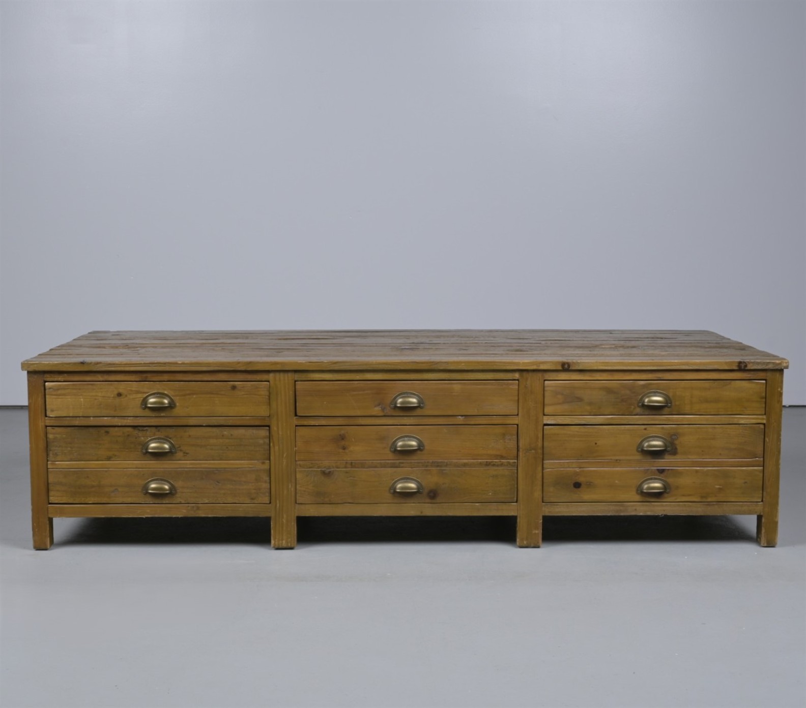 A LARGE PINE LOW TABLE WITH DRAWERS (46CM H X 180CM W X 90CM D) (THIS ITEM MUST BE REMOVED BY PROFESSIONAL CARRIERS OR CLIENTS. LEONARD JOEL STAFF CANNOT ASSIST WITH CARRYING OR DELIVERY OF THIS ITEM)