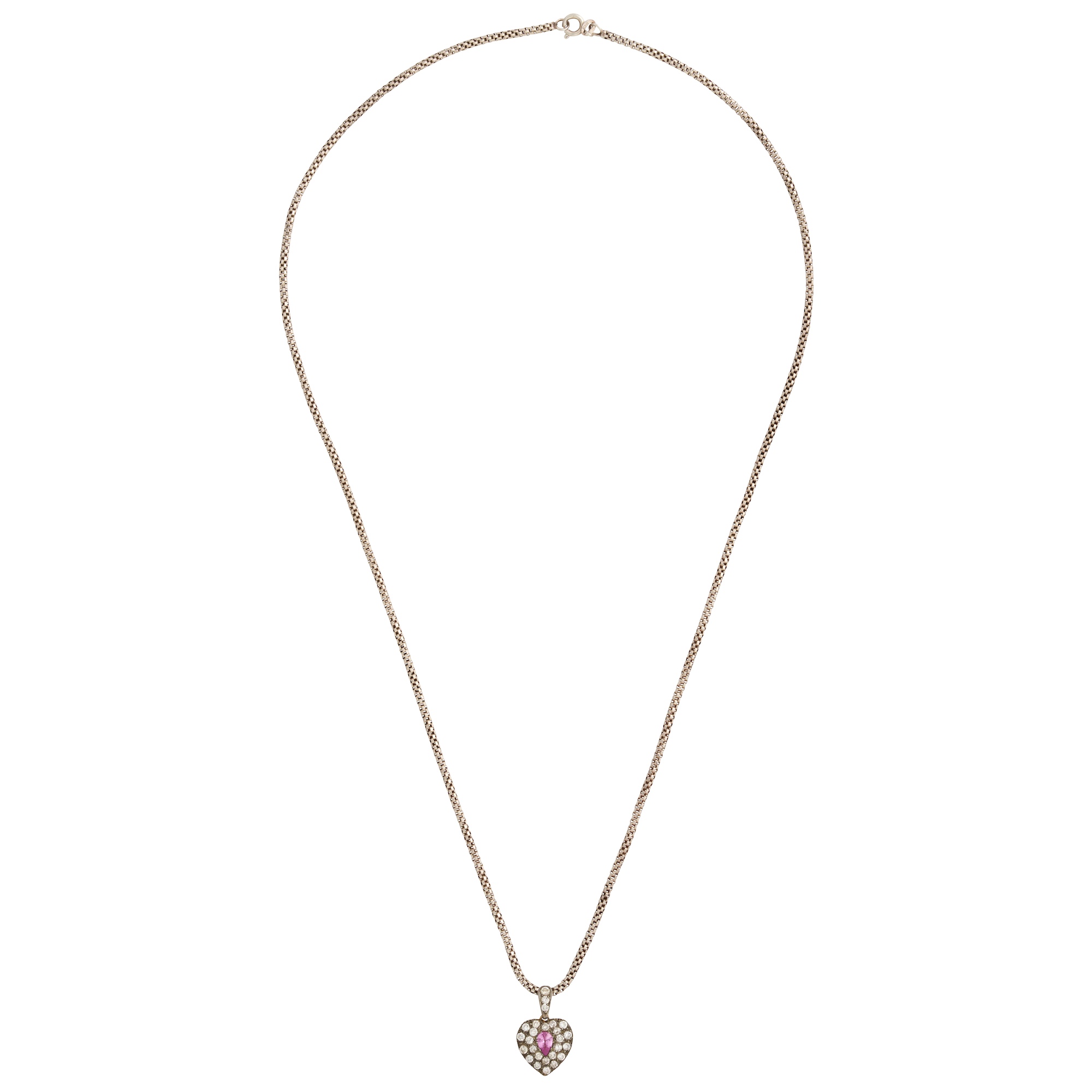 Of cluster design, centring a pear-cut pink sapphire weighing approximately 0.50carats, surrounded by pavé-set old European-cut diamonds to a graduated diamond set bale, the diamonds together weighing approximately 0.63 carats, suspended from a round box chain in sterling silver, pendant length 22mm, width 14mm, chain length 600mm, gross weight approximately 10.3 grams.
