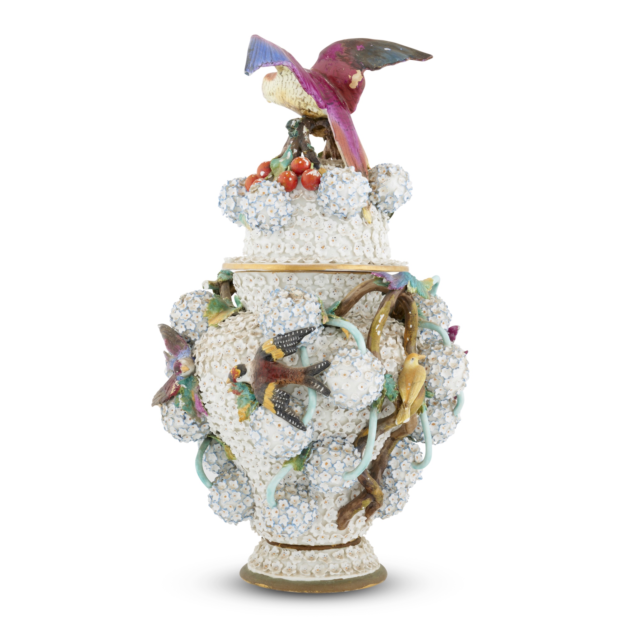After the eighteenth century Meissen originals, baluster-shaped with a domed cover and a pair of sinuous grape vine handles, the ground and applied 'snowballs' entirely and densely covered with small flower heads, the cover with a large figure of a spread-winged parrot on a fruiting branch as a finial, the body with smaller figures of various birds, without maker's marks