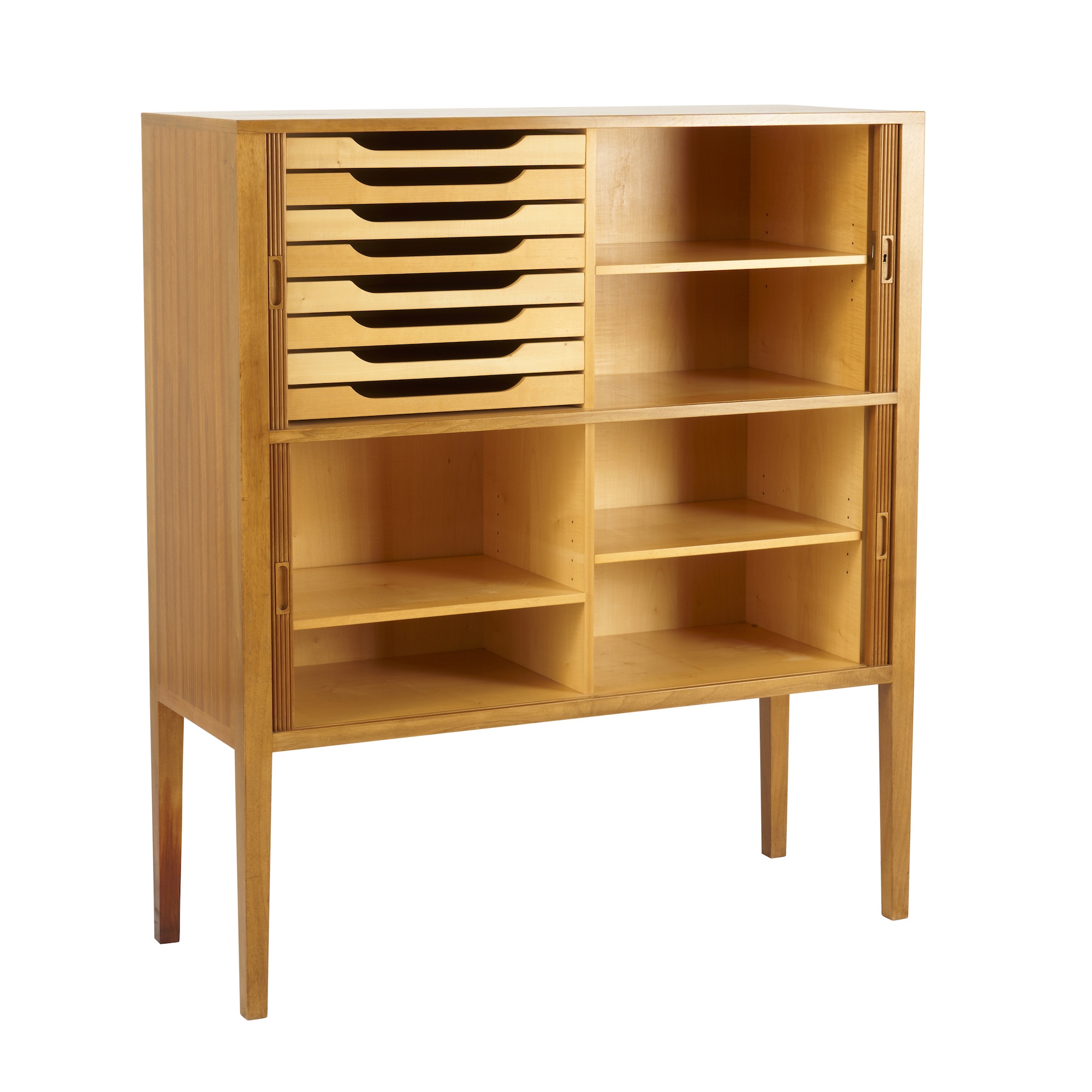 Teak with two tiers of tambour doors, shelving and shallow drawers to interior.