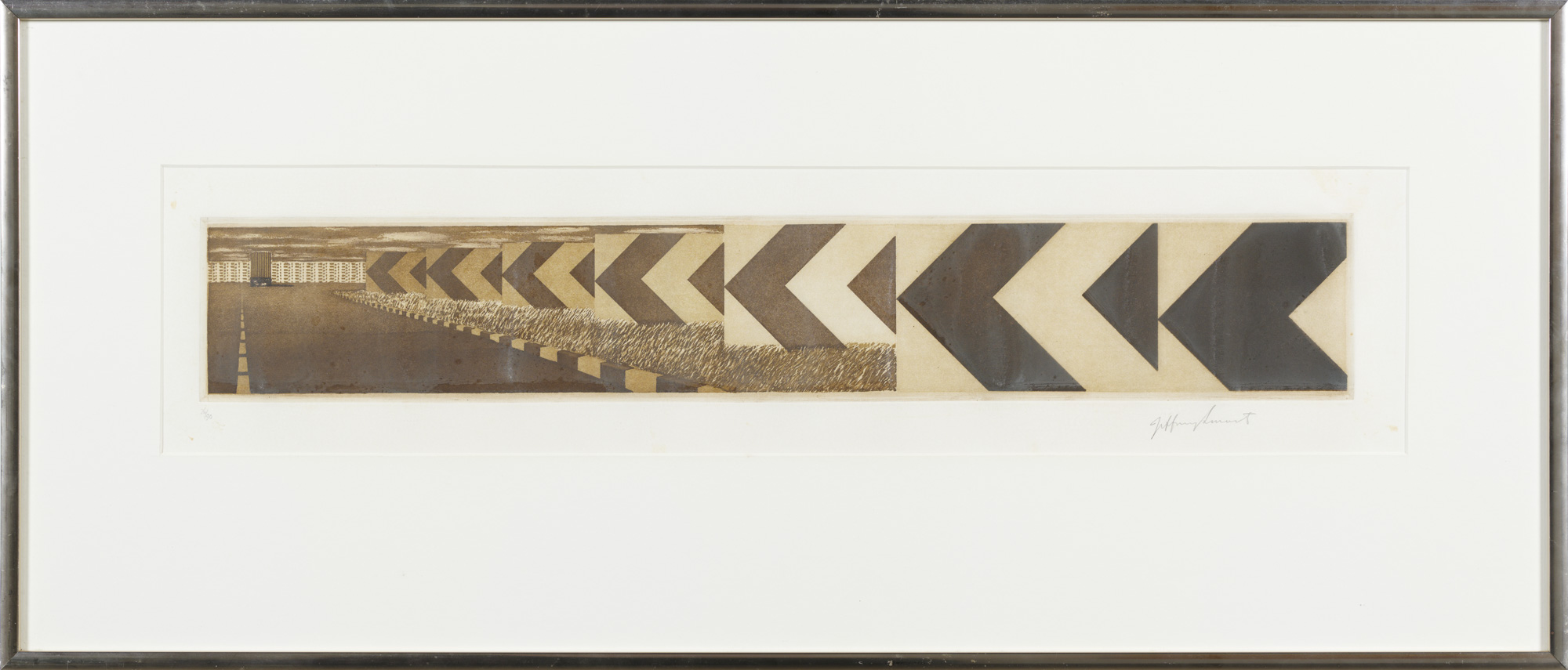 Jeffrey Smart, The Directors 1980, aquatint on paper, 11.8 x 75cm, the collection of Art Gallery of South Australia, Adelaide