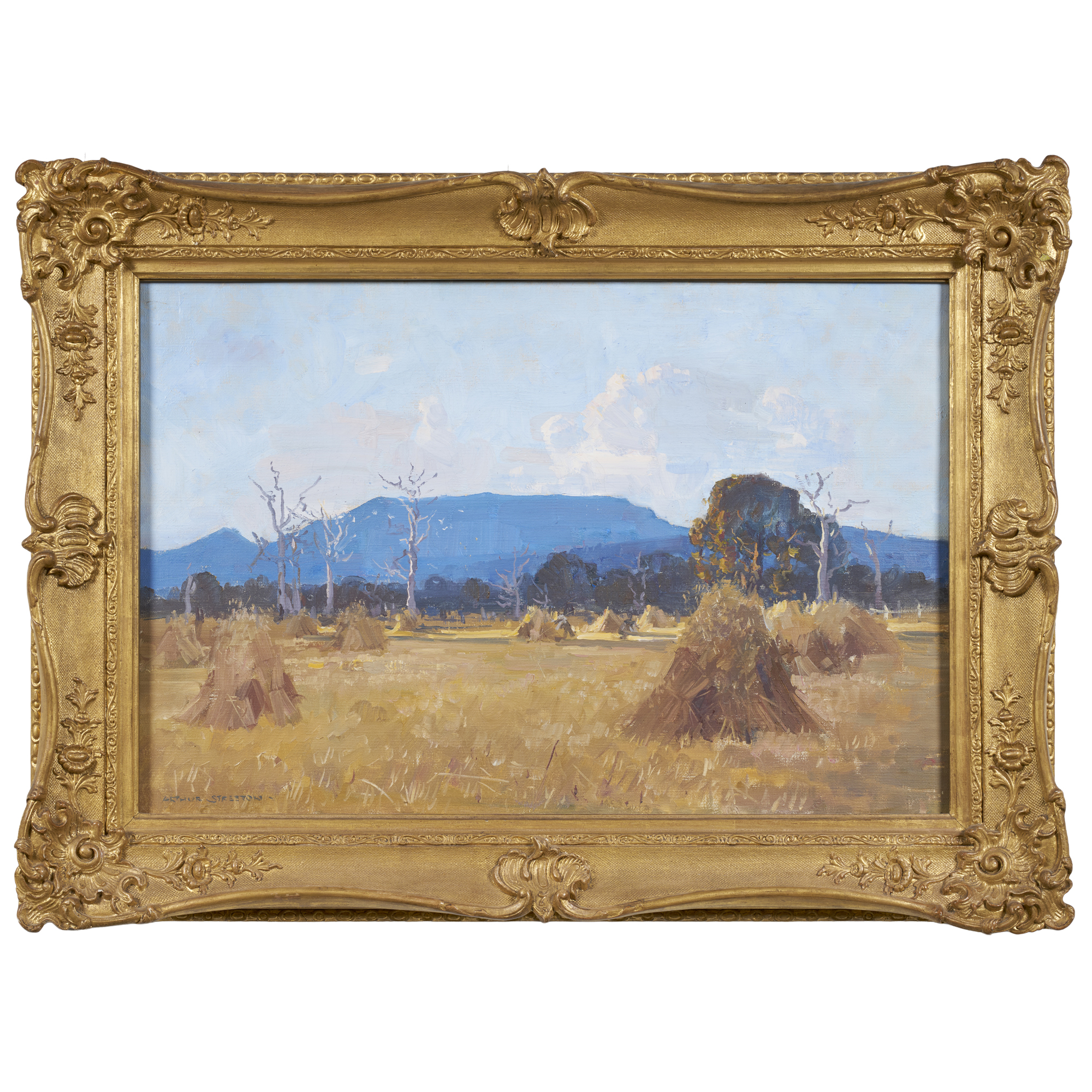 The artwork 'Harvest and Mt. William' 1926 (lot 12), exemplifies Streeton's late Western District vision and draws together many of the thematic and formal concerns evident in his Land of the Golden Fleece paintings. The work was included in his show at the Fine Art Society's Gallery in Melbourne in 1927 as catalogue number 8, alongside other key artworks from the Western District, including one of the three versions of 'Land of the Golden Fleece', 'Oat Harvest' and 'Mt. William'. In the work, the composition presents a harvested field scattered with hay stooks, their warm and golden tones dominating the foreground. These forms create a rhythmic pattern across the surface of the canvas, guiding the viewer's eye laterally while reinforcing the sense of abundance and order. Beyond the field, a line of trees, some verdant, others bare, marks the transition between cultivated land and the distant range. The bare trunks of dead trees in the middle ground of the work introduce a melancholic note, subtly complicating the harvest's celebration with a reminder of seasonal change and potential devastation to the land. Mount William rises softly along the horizon, painted in cool blue and violet hues that contrast with the sunlit paddocks below. The sky is expansive and lightly animated with clouds, contributing to the overall sense of clarity and openness that characterises Streeton's Western District artworks.