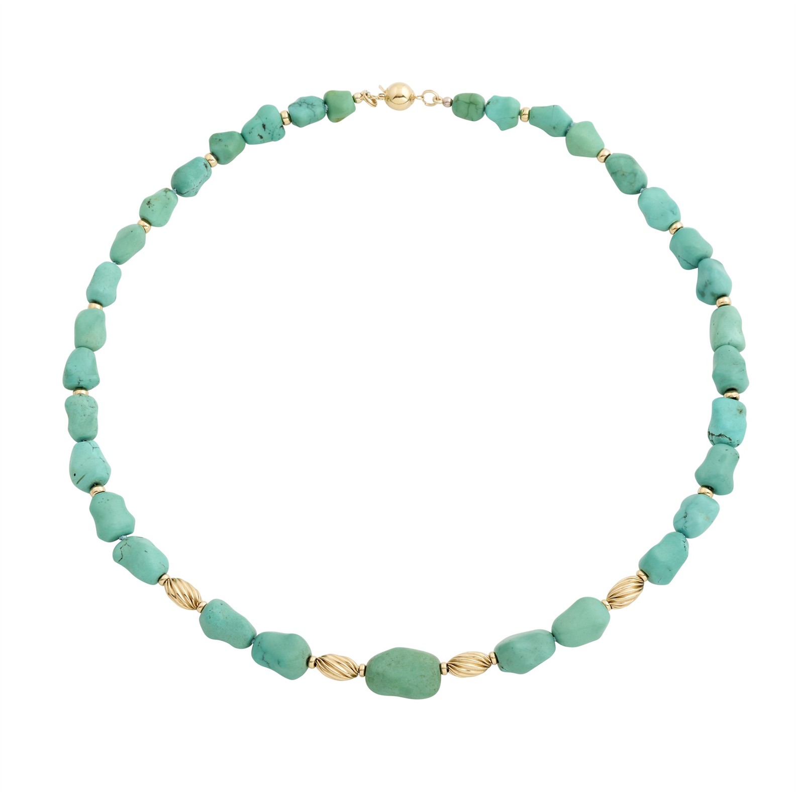 Composed of a line of tumbled turquoise beads, interspersed by 9ct gold fluted gold beads and rondels, completed by a 14ct gold clasp, inner circumference 530mm, gross weight approximately 53.0 grams.