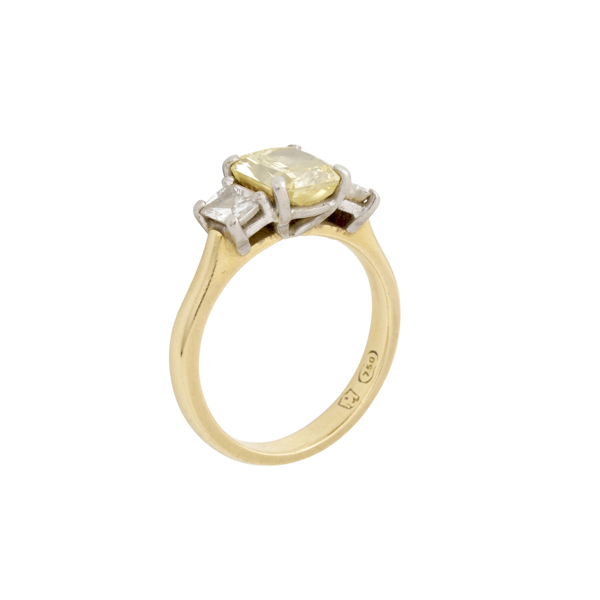 Centring a claw-set modified cushion-cut fancy yellow diamond weighing approximately 1.50 carats, flanked by two claw-set emerald-cut diamonds, the diamonds together weighing approximately 1.90 carats, with a fitted claw-set diamond wedding band, size I & J, gross weight approximately 6.9 grams.