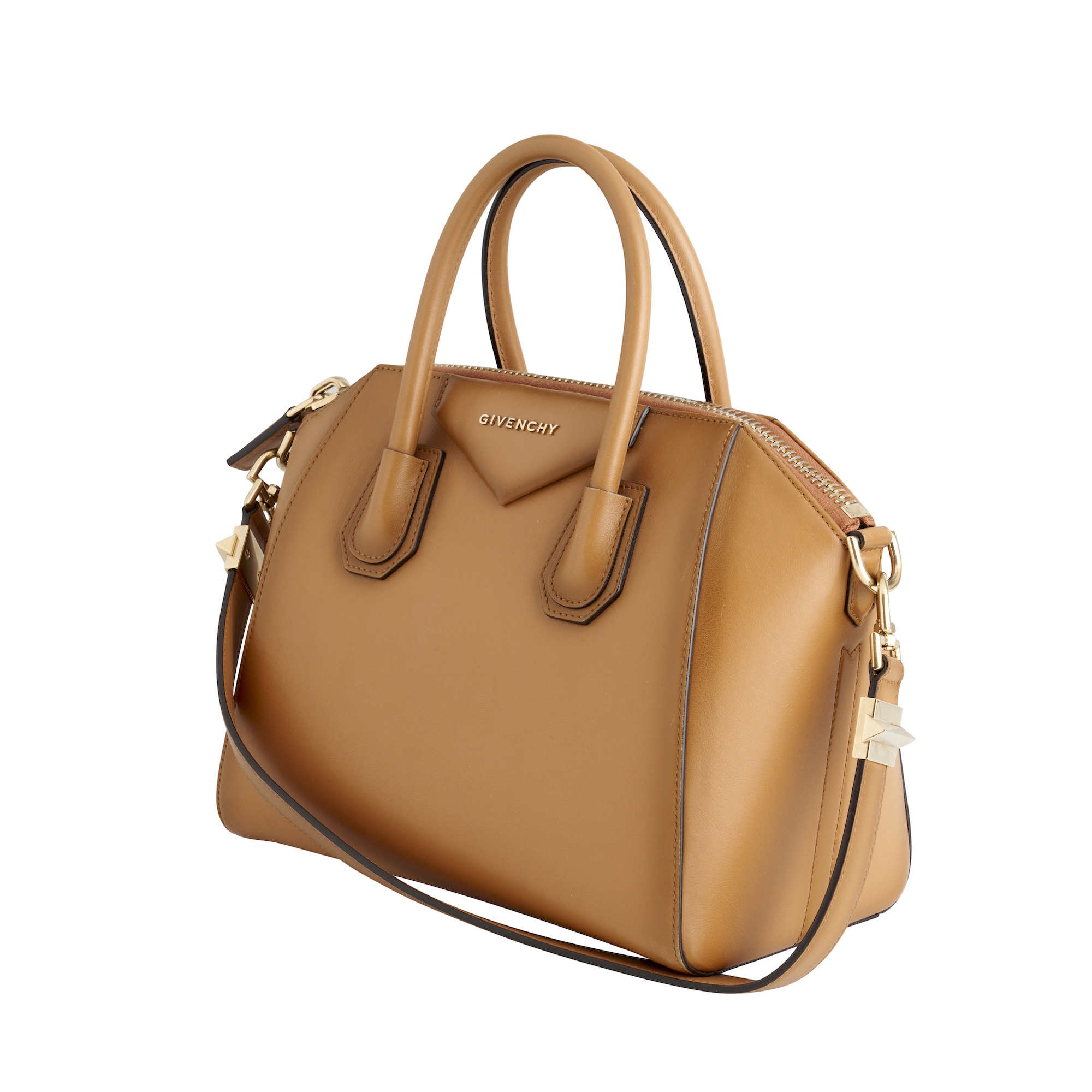 Styled in tan leather with gold tone hardware, featuring oversized zip detail, measures 28 x 24 x 17 cm.