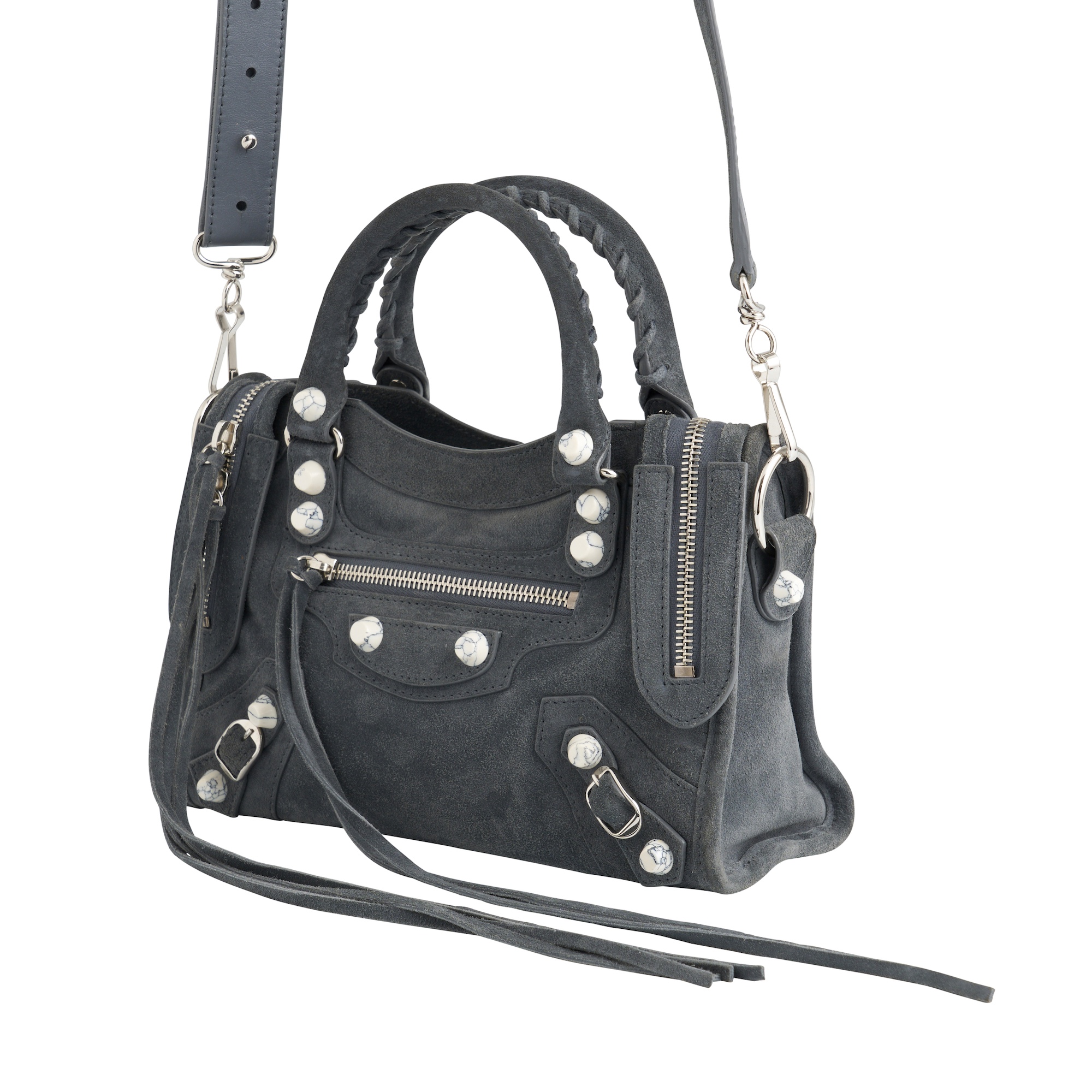Styled in grey suede with marble effect studs and silver tone hardware, featuring tassle zip and braided handle details, 24 x 16 x 8 cm.