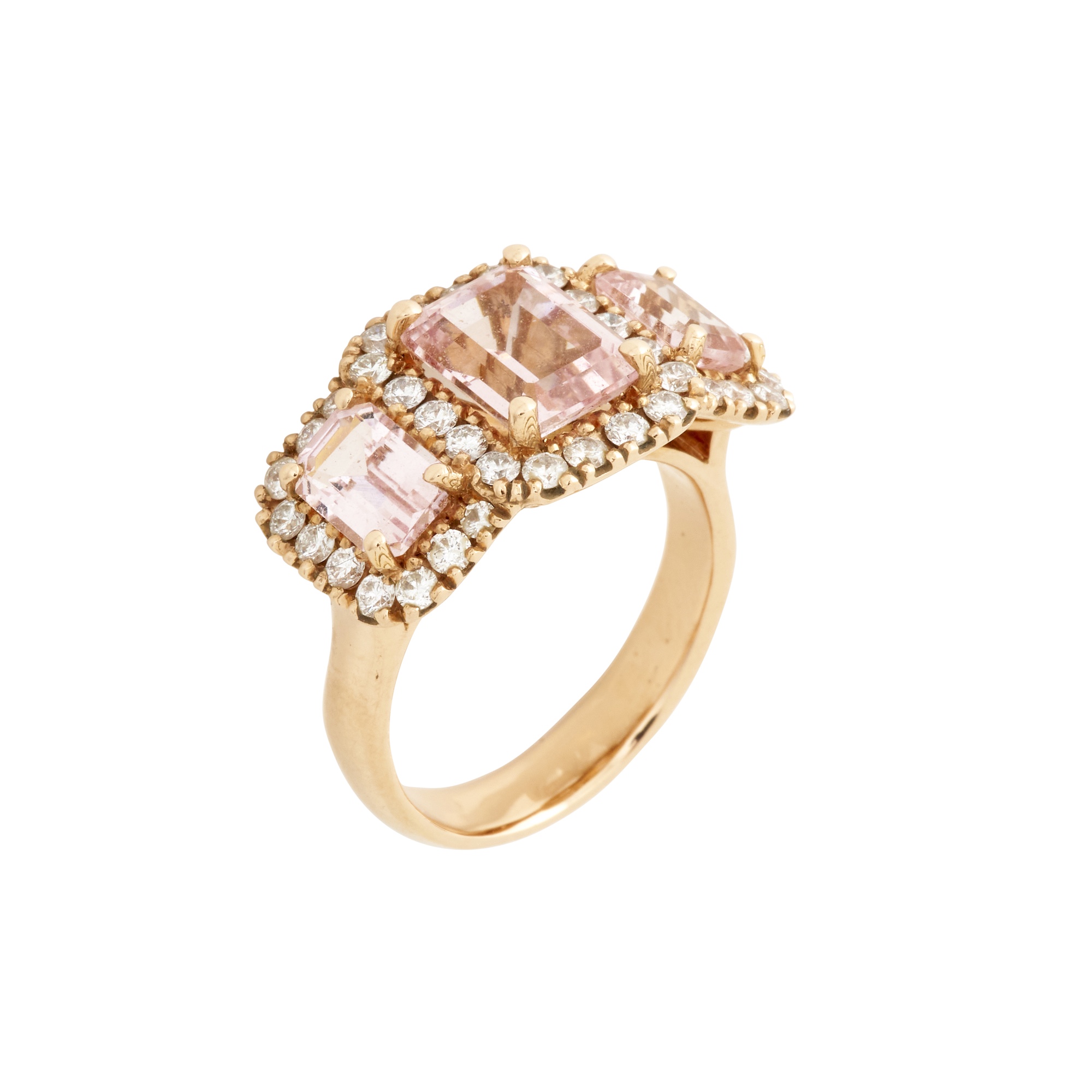 Of triple cluster design, claw-set with three emerald-cut morganites, each within a surround of claw-set round brilliant-cut diamonds, the morganites together weighing approximately 4.20 carats, the diamonds together weighing approximately 1.50 carats, size P, gross weight approximately 10.5 grams.