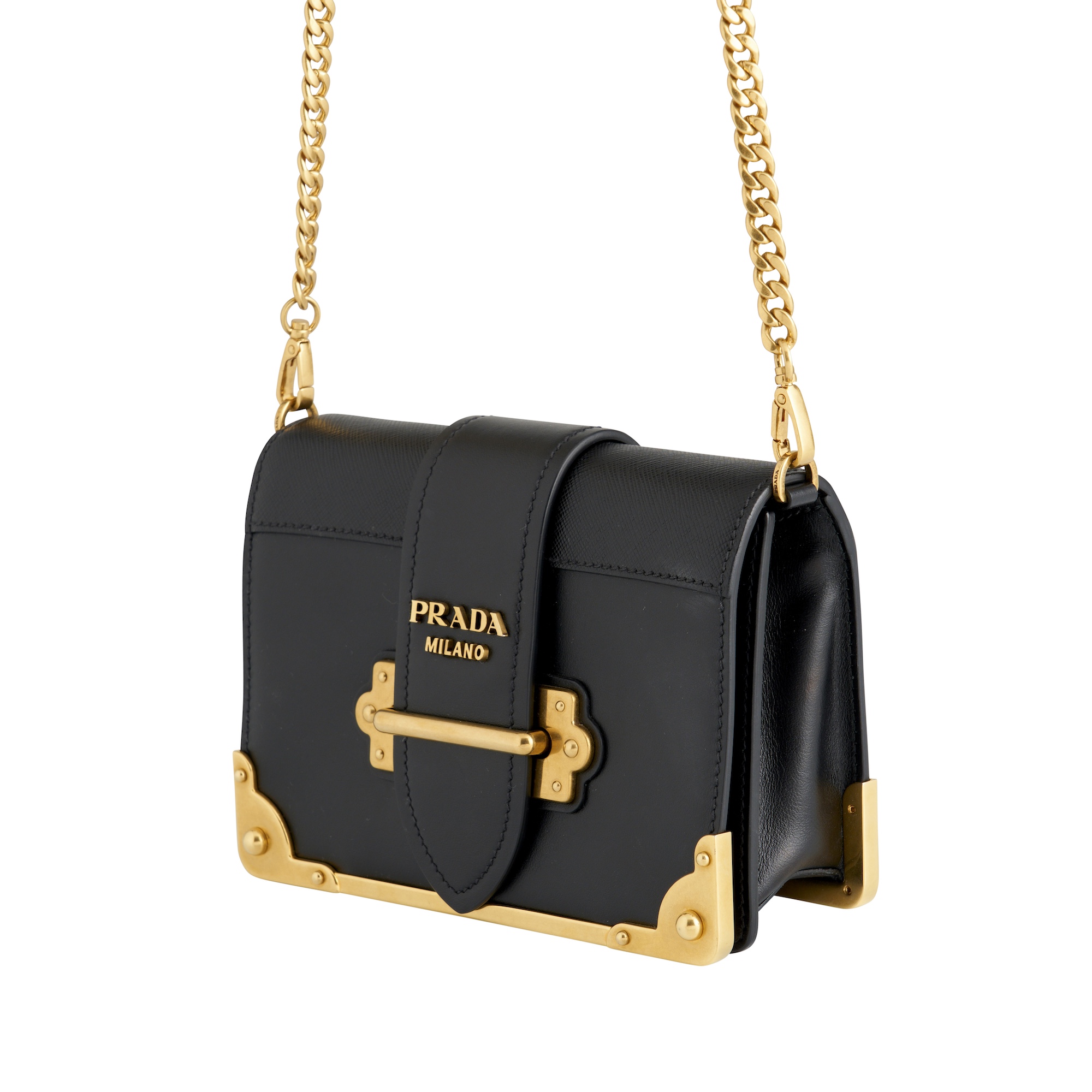 Styled in black leather with gold tone hardware featuring metal edging and chain strap details, measures 19 x 13 x 5.5 cm.
