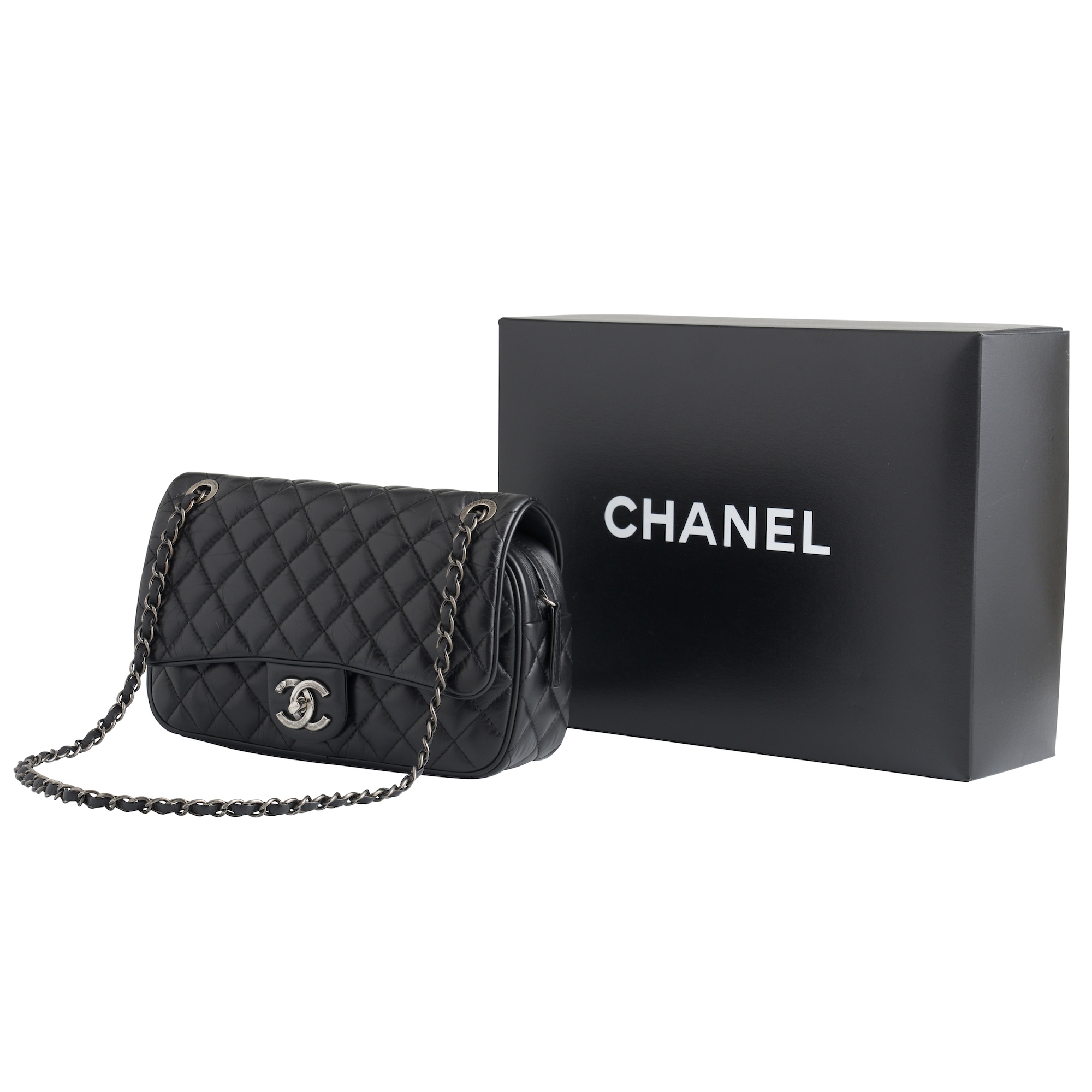 Styled in plush quilted black lambskin with silver tone hardware, featuring 'CC' logo twist closure and chain strap details, measures 26 x 15 x 7 cm.