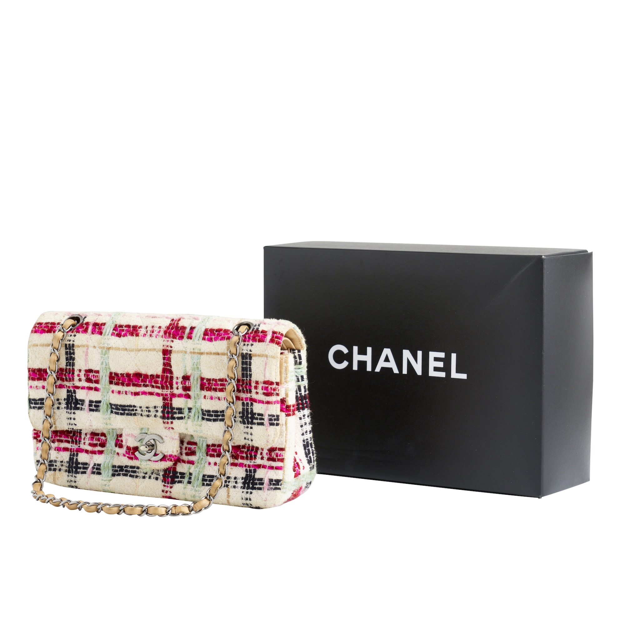 Styled in cream and multicolor plaid tweed with tan leather trim, featuring 'CC' logo twist closure and braided chain strap details, measures 26 x 13 x 7 cm.