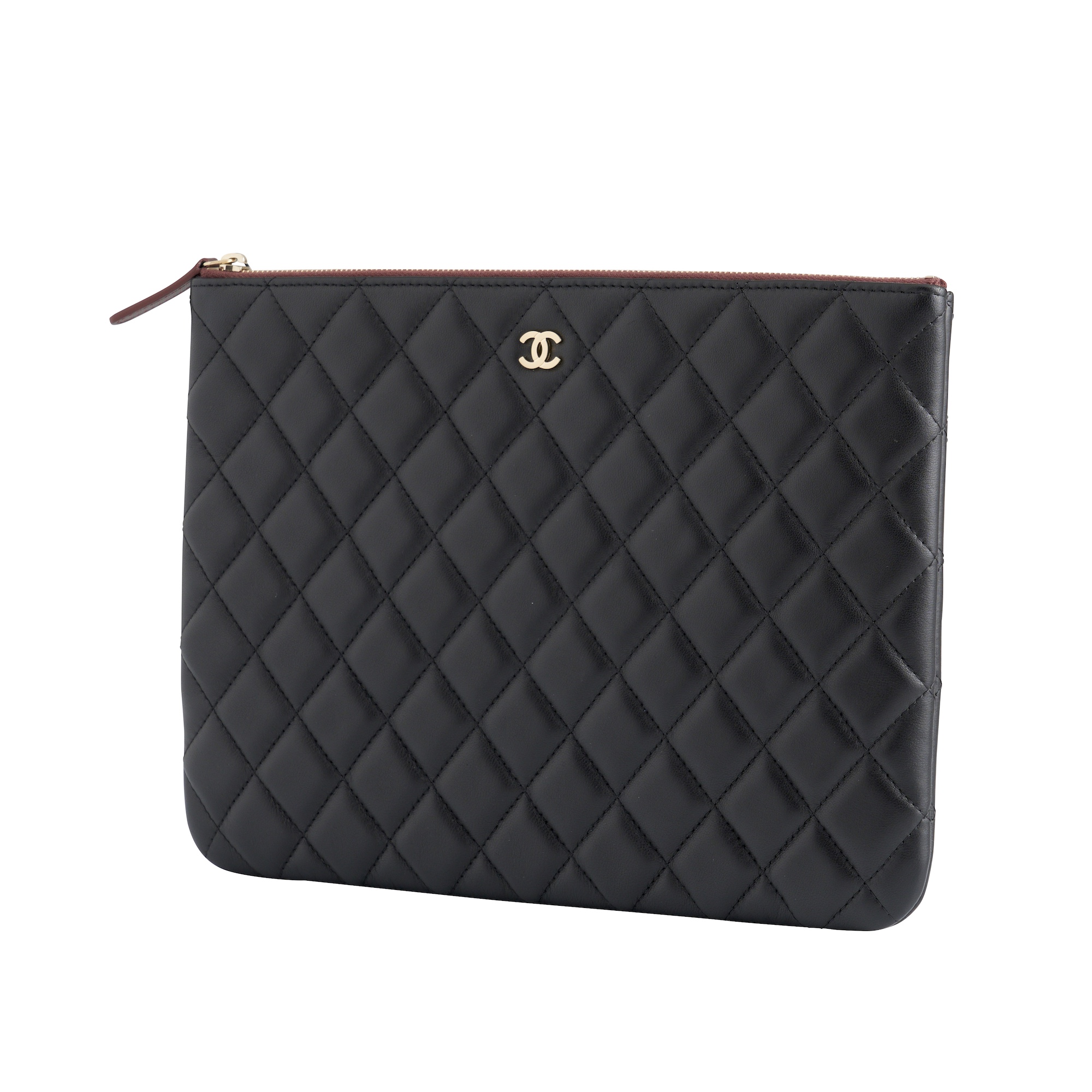 Styled in black quilted leather, featuring matte silver tone 'CC' logo, designed with burgundy coloured interior and leather pull tab, measures 28 x 20 x 1 cm.