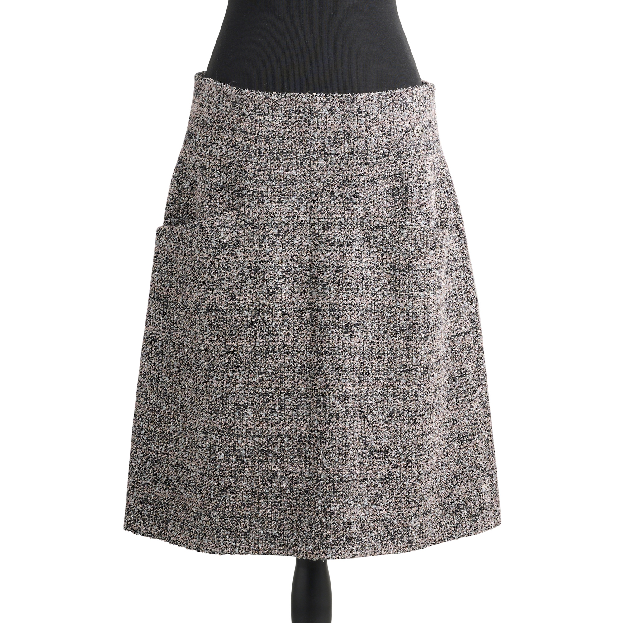 Styled in wool and silk blend tweed in tones of pink, silver and black, jacket designed with double breasted closure featuring self covered buttons with gunmetal hardware and 'CC' logo charm and A-line skirt with single button closure and zip to the back, jacket marked size 40 and skirt marked size 42.